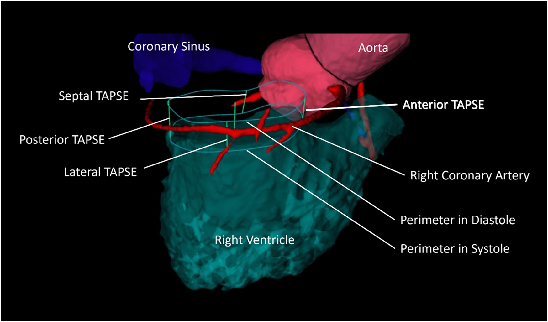 Exemplary illustration of CT-analyzed TAPSE. The illustration depicts the perimeter of the tricuspid valve in diastole and systole and its excursion in anterior, posterior, septal, and lateral locations. The space between the diastolic and systolic position of the perimeter is the “TAPSE volume.”