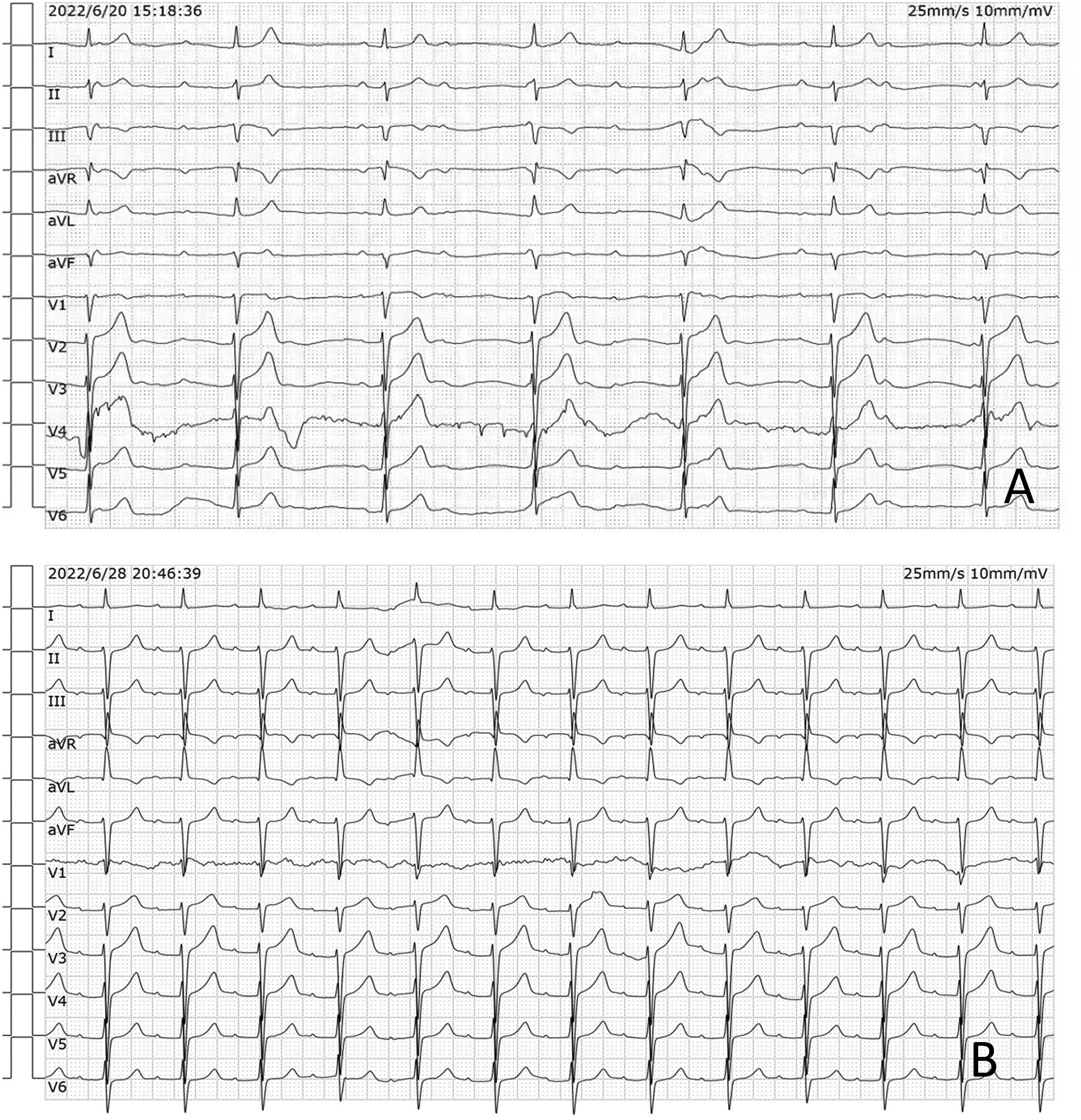 (A) The preoperative 12-lead ECG showed a third-degree atrioventricular block. (B) The postoperative ECG showed a first-degree atrioventricular block.