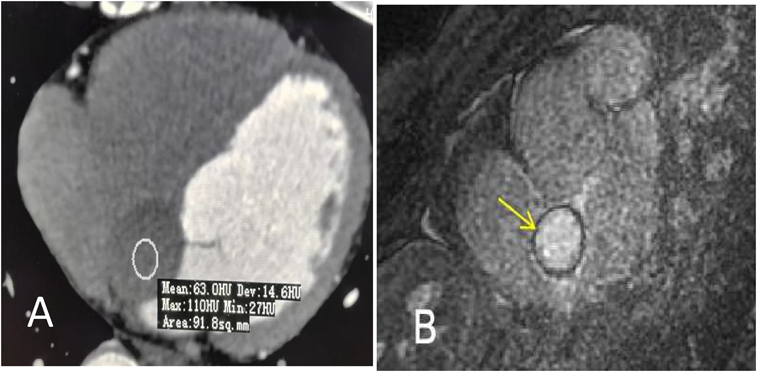 (A) Contrast-enhanced CT shows a low-intensity ovoid nodule without obvious enhancement at the interatrial septum (arrow). The mean attenuation value was approximately 63 Hu. (B) Cardiac MRI shows a round mass in the interatrial septum measuring 30 mm × 20 mm (arrow). Neither fat deposition nor late gadolinium enhancement were identified in the tumor.