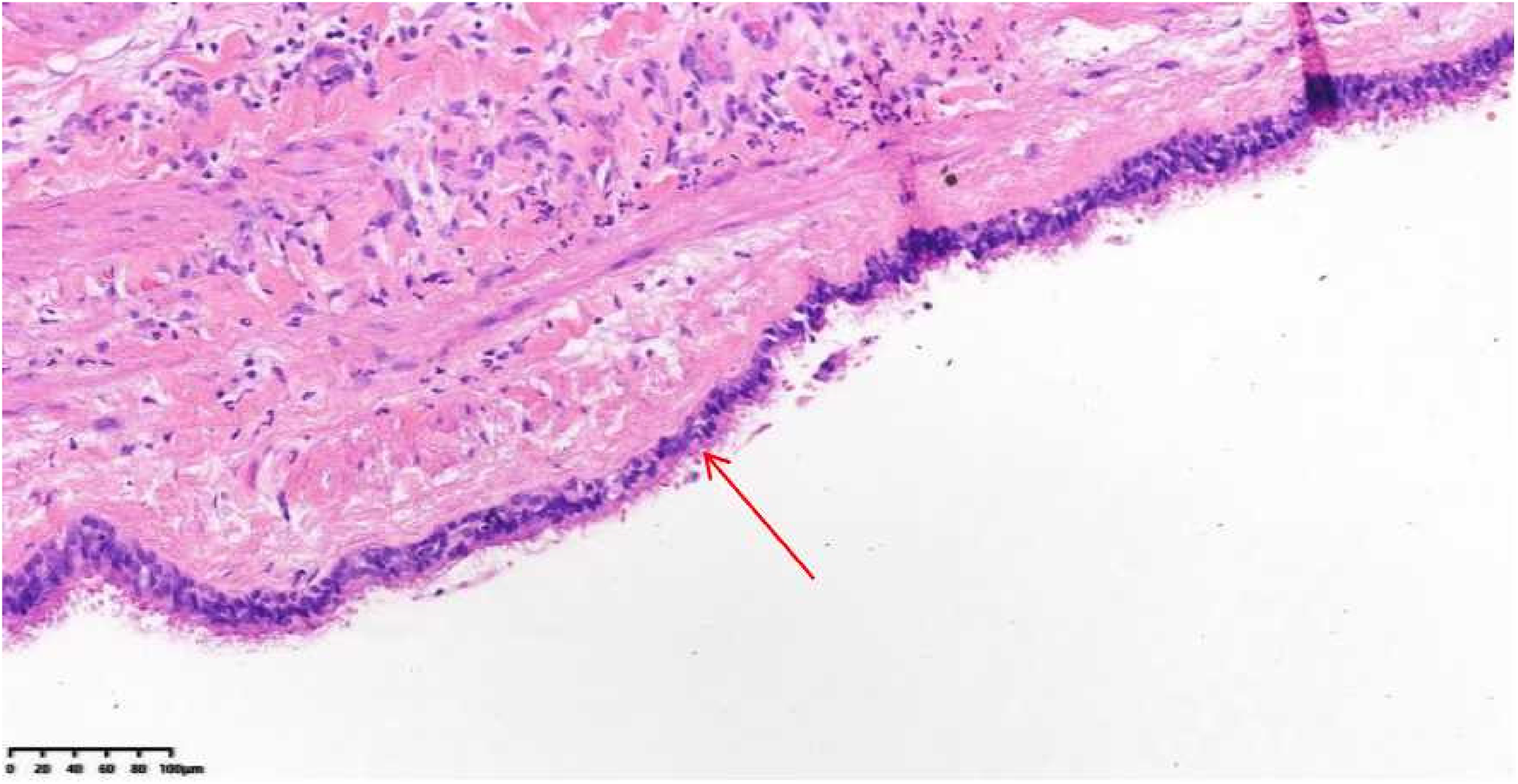 Histology shows the surface of the cystic lesion lined by pseudostratified ciliated columnar epithelium (arrow), smooth muscle cells within the fibrous tissue wall of the cyst, and acute inflammatory cells.