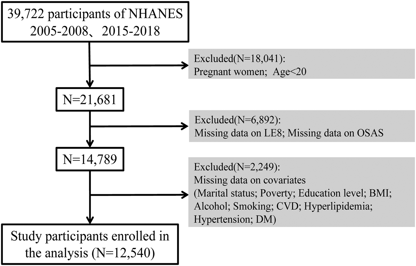 In our study, we employed data from NHANES spanning the years 2005–2008 and 2015–2018, comprising a total initial sample size of 39,722 participants. After excluding pregnant women, individuals under 20 years, and those with missing data on OSA symptoms, LE8 score-related indicators, marital status, income level, education level, BMI, alcohol consumption, smoking, and CVD, data from 12,540 participants was included in our analyses (Figure 1). We employ the List-wise Deletion method to remove entire rows that contain any missing values. This approach is advantageous due to its simplicity and ease of implementation, while also preserving the distribution of the data (Supplementary Material).