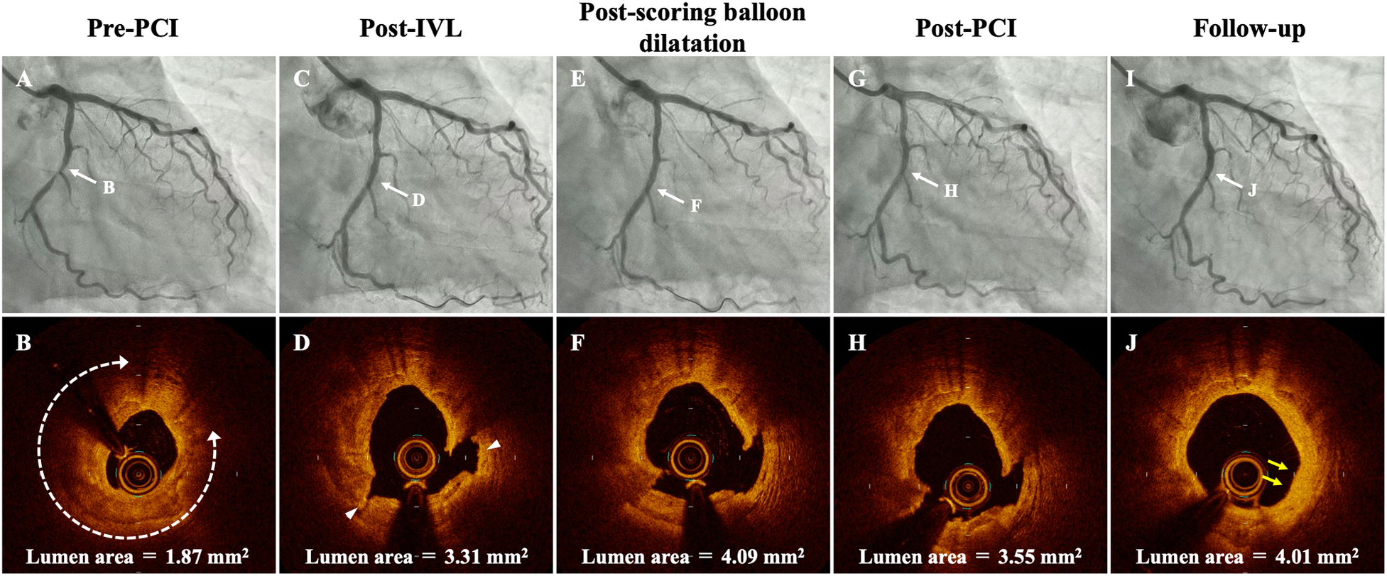Serial coronary angiogram (CAG) and corresponding optical coherence tomography (OCT) images of the patient. (A,B) Pre-PCI CAG and OCT shows a severely calcified coronary stenosis in the mid-left circumflex artery (LCX) with 279° of calcium angle (white-dotted double headed arrows), 0.81 mm of calcium thickness, 5.1 mm of calcified segment length, and 1.87 mm2 of minimum lumen area. (C,D) Post-IVL CAG and OCT demonstrates good expansion at the lesion with two calcium fractures (arrowhead). (E,F) Post-scoring balloon dilatation CAG and OCT showed that lumen area was significantly enlarged. (G,H) CAG and OCT after PCI shows no significant residual stenosis and acceptable lumen area. (I,J) Follow-up CAG and OCT at 8 months after the procedure. Restenosis is not observed at the mid-LCX, and OCT demonstrates homogeneous neointima with late lumen enlargement in the modified calcified lesions (yellow arrows). IVL, intravascular lithotripsy; PCI, percutaneous coronary intervention.