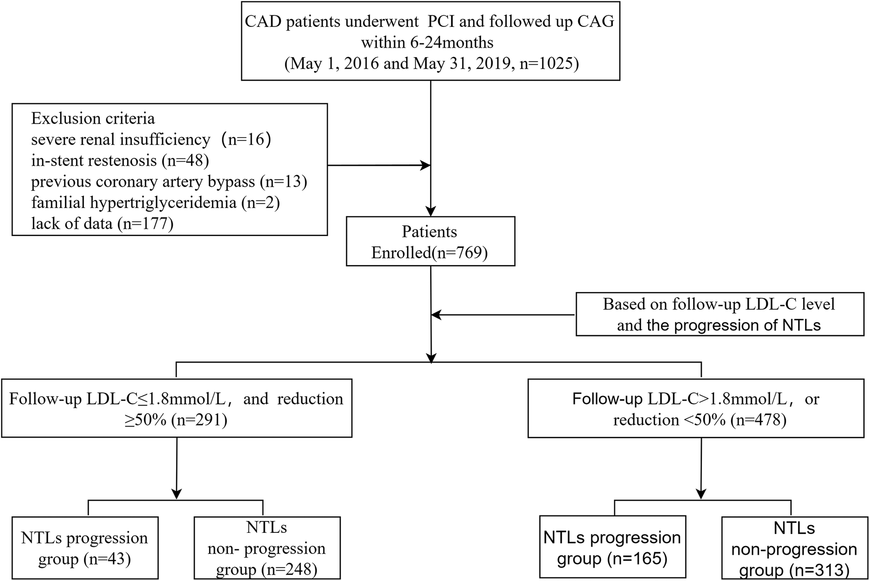 The study enrolled a total of 769 patients, with 291 (37.84%) meeting the lipid goals, including 43 (14.78%) in the NTLs progression group. Additionally 478 (62.16%) failed to meet the lipid goals, including 165 (34.52%) in the NTLs progression group (Figure 1).