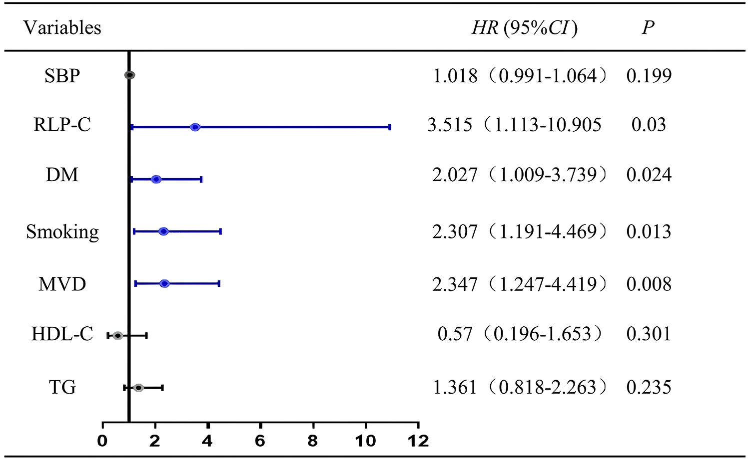 Cox regression analysis for the presence of non-target lesion progression. SBP, systolic pressure; RLP-C, remnant lipoprotein particle cholesterol; DM, diabetes mellitus; HDL-C, high density lipoprotein cholesterol; MVD, multivessel disease.
