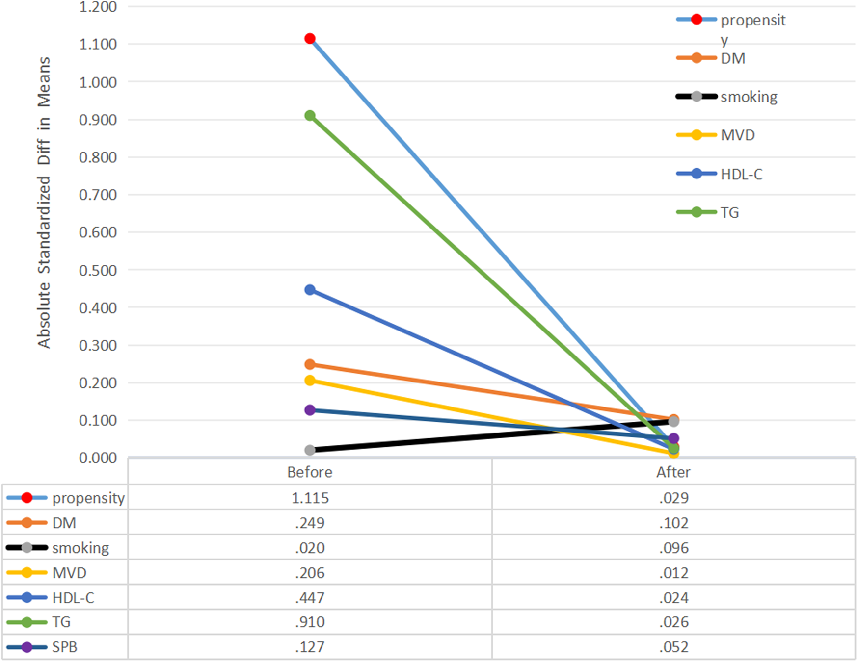 Absolute standardized differences in unweighted and propensity score-weighted data sensitivity analyses. DM, diabetes mellitus; MVD, Multivessel disease; HDL-C, high density lipoprotein cholesterol; TG, triglyceride; SBP, systolic pressure.