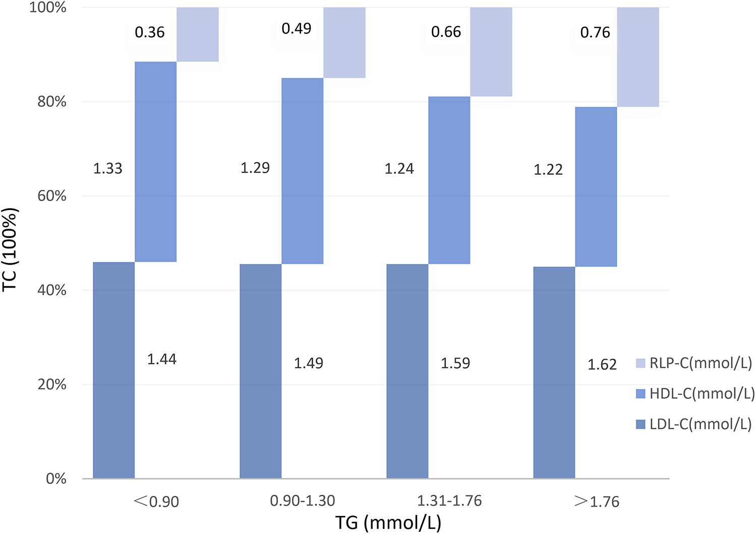 RLP-C and its proportion in TC at different TG levels in well-controlled LDL-C individuals. RLP-C, remnant lipoprotein particle cholesterol; HDL-C, high density lipoprotein cholesterol; LDL-C, low density lipoprotein cholesterol.