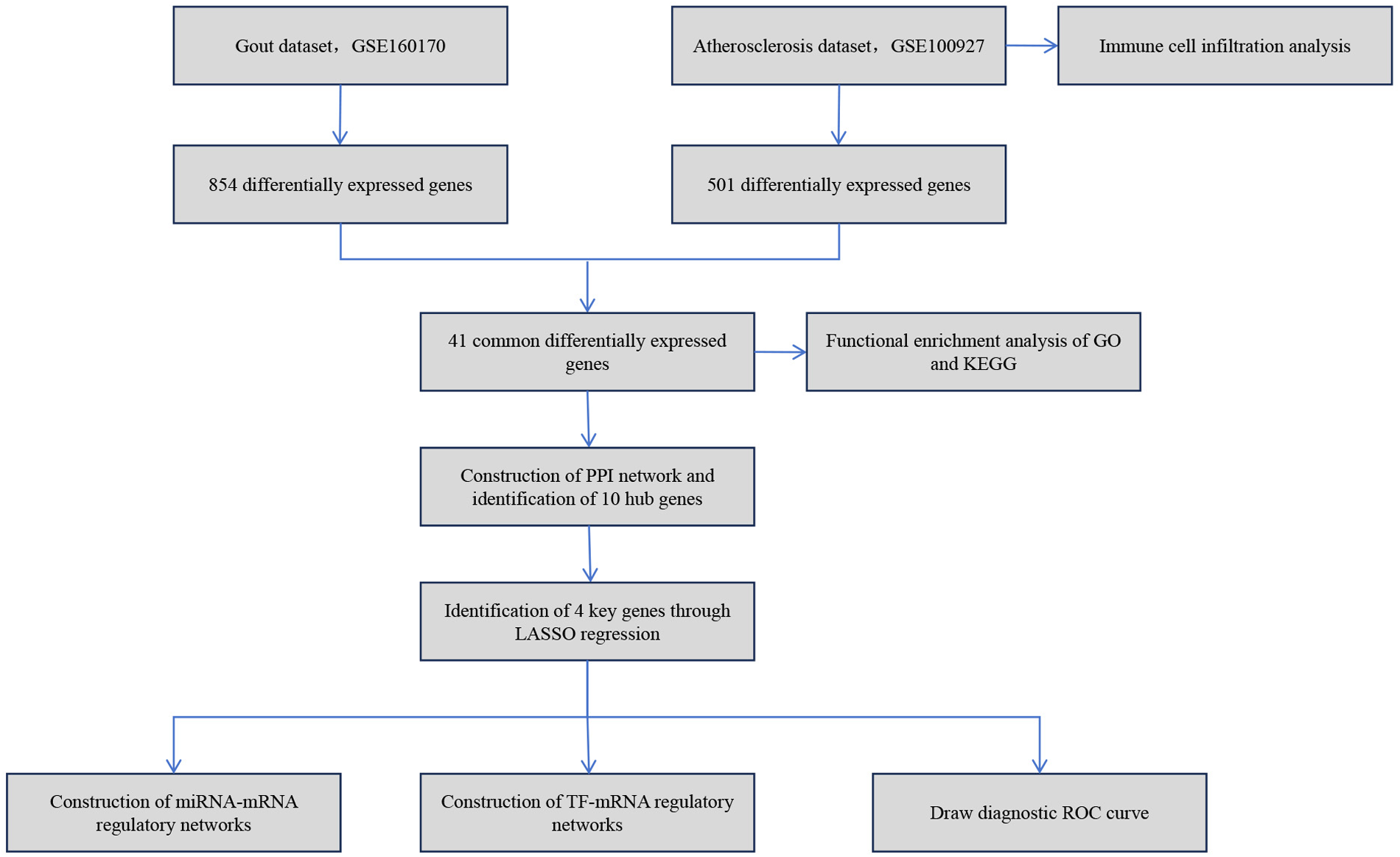 Thus, this study is dedicated to thoroughly analyzing the relationship between gout and atherosclerosis, with a focus on revealing the common molecular mechanisms of the two diseases. By comprehensively applying various bioinformatics techniques, this study successfully identified the key molecules and their signaling pathways commonly related to both gout and atherosclerosis. Moreover, the study constructed the regulatory networks of these key molecules involving transcription factors and miRNAs. The findings not only enrich our understanding of the relationship between gout and atherosclerosis but also offer a new theoretical basis and research direction for future exploration of the interaction mechanisms between these two diseases. The simplified analysis workflow of this study is illustrated in Figure 1.
