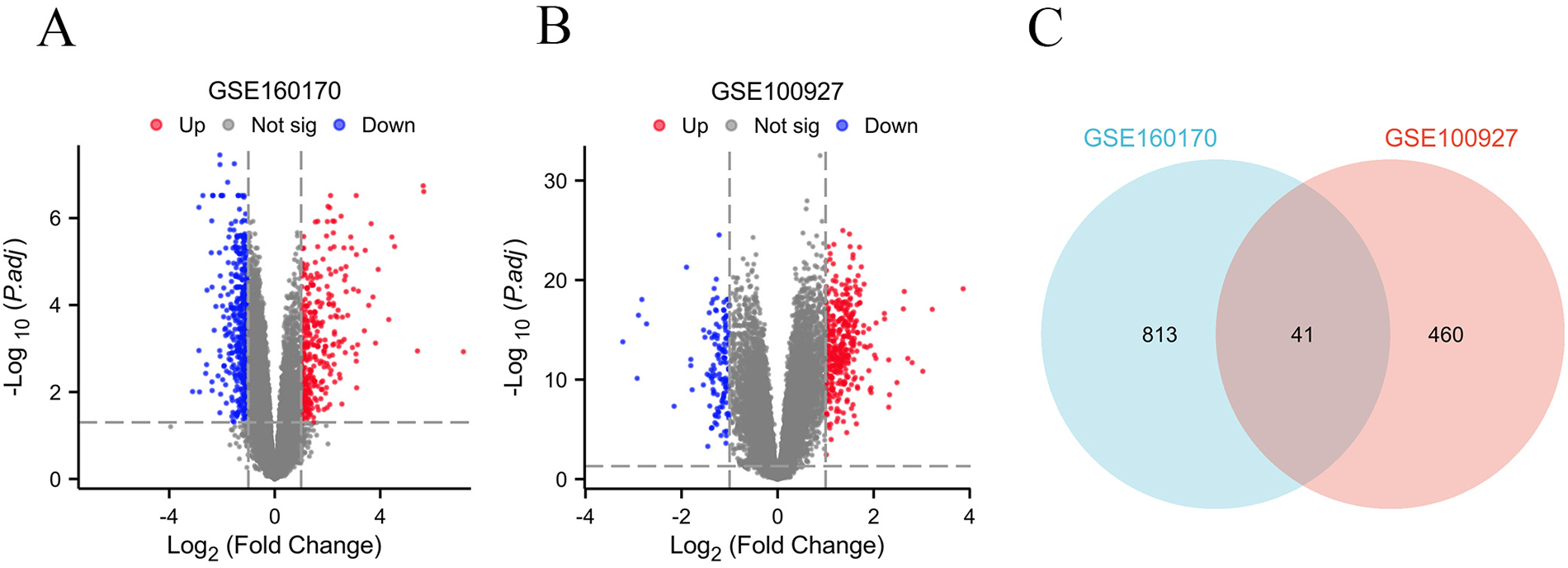 Identification of common DEGs between gout and atherosclerosis. (A) Volcano plot of DEGs in gout; (B) Volcanic plot of DEGs in atherosclerosis; (C) Venn diagram of DEGs in gout and atherosclerosis.