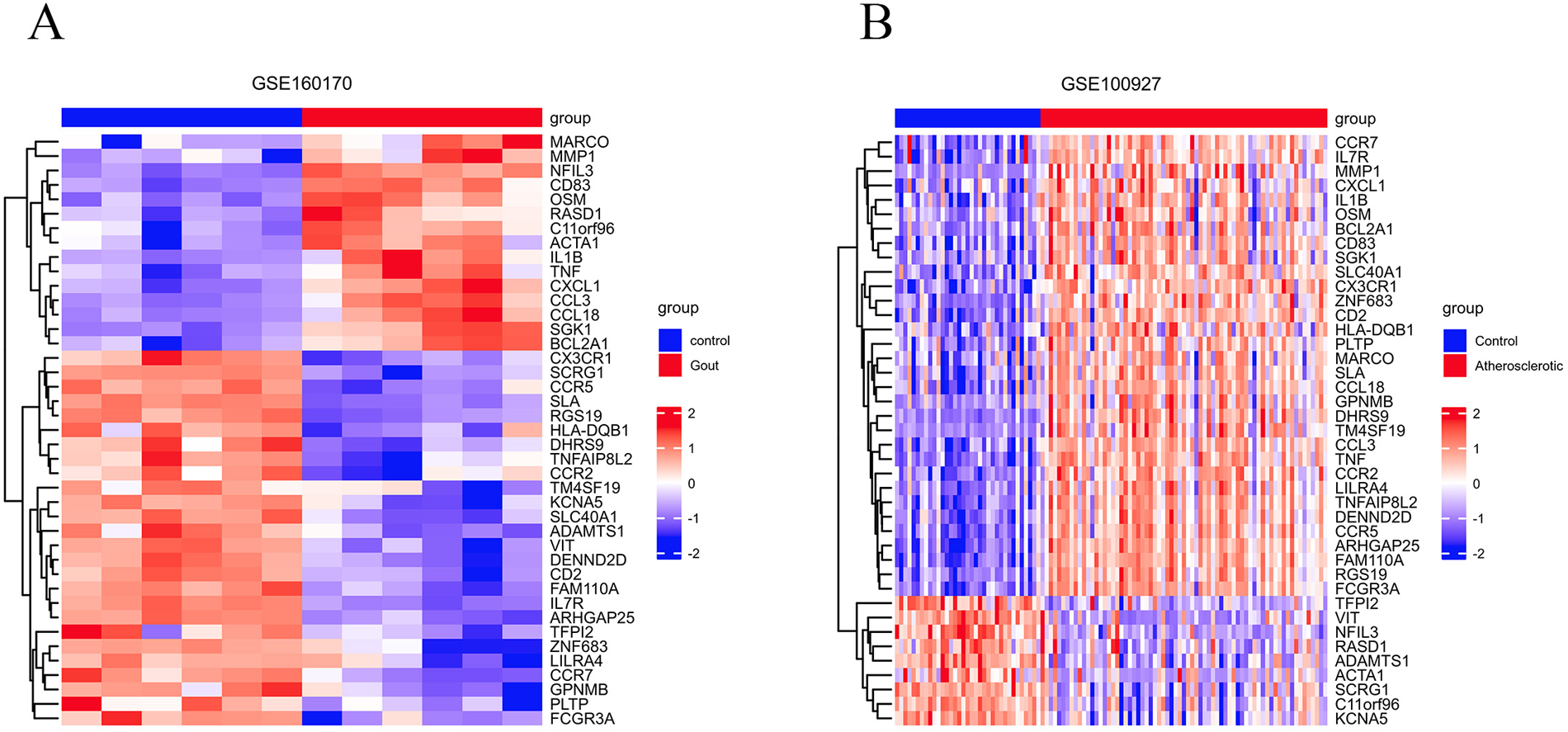 The 41 common DEGs between gout and atherosclerosis. (A) Heatmap of common DEGs in gout; (B) heatmap of common DEGs in atherosclerosis.