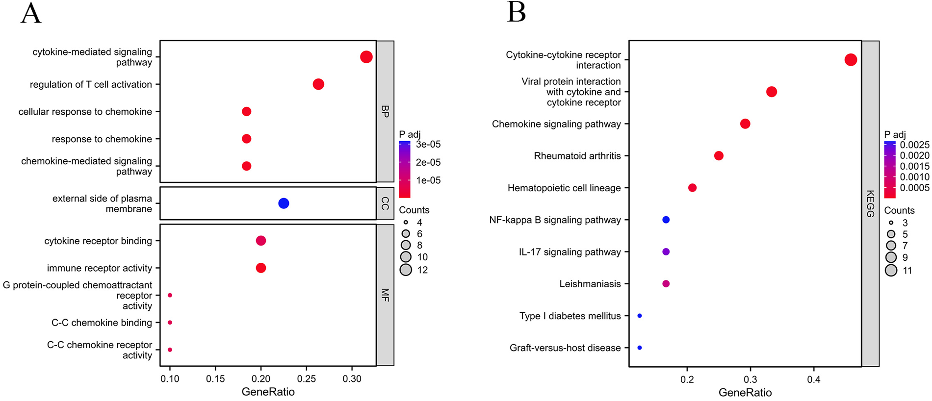 In order to investigate the biological roles of the 41 common DEGs between gout and atherosclerosis, GO as well as KEGG enrichment analyses were performed. The findings revealed that the common DEGs were primarily involved in “regulation of T cell activation”, “chemokine-mediated signaling pathway”, “cytokine-mediated signaling pathway”, as well as “cytokine receptor binding” (Figure 4A). The KEGG analysis revealed that these genes were significantly involved in pathways like “cytokine-cytokine receptor interaction”, “chemokine signaling pathway”, and “interaction between viral proteins and cytokines and cytokine receptors” (Figure 4B).