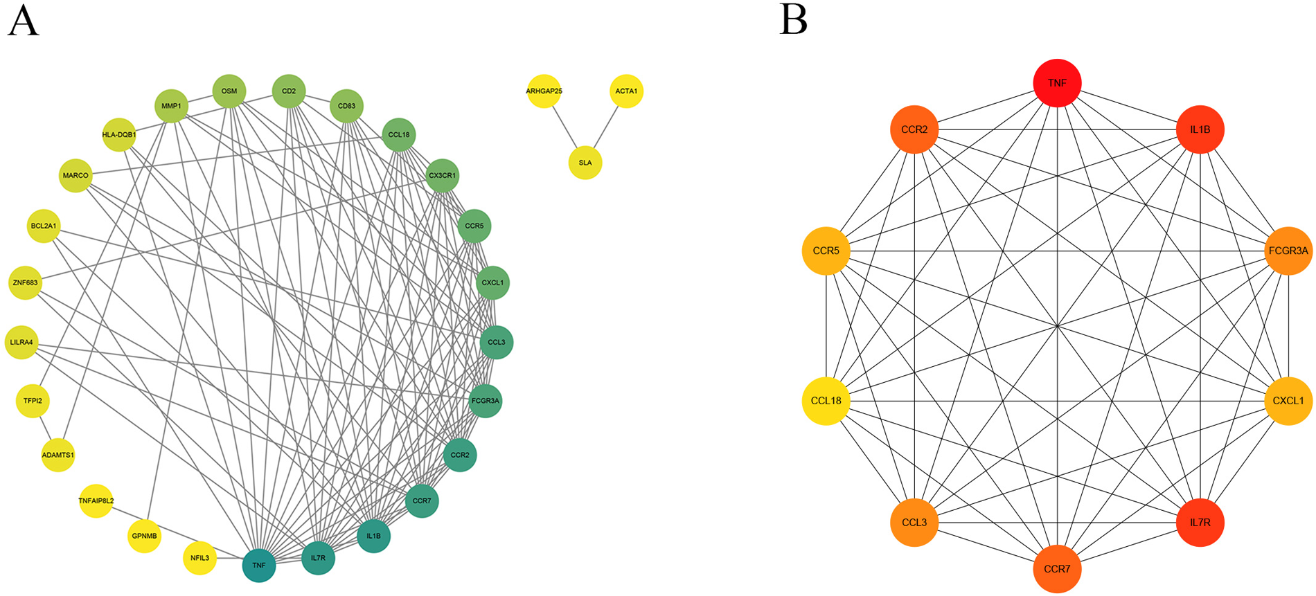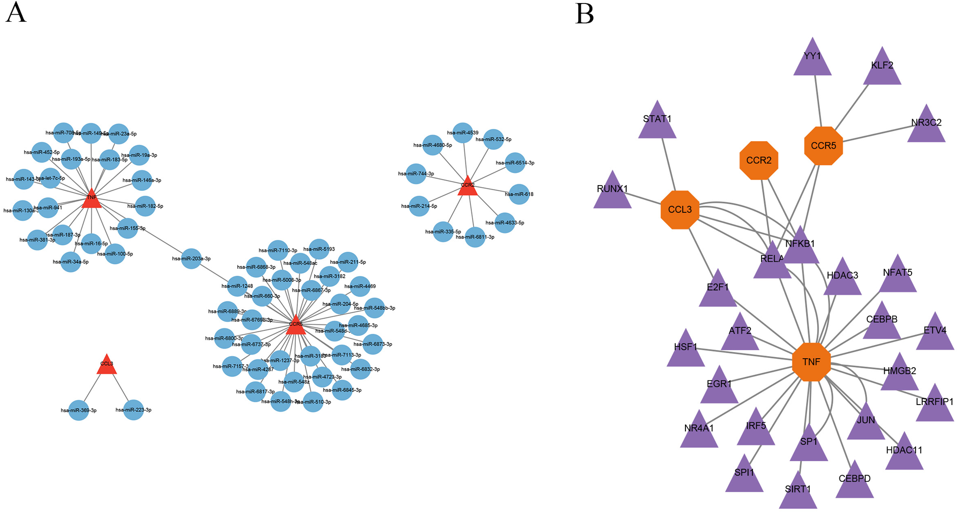 The miRTarBase database was employed to forecast miRNAs that regulate the target genes, and the miRNA-mRNA regulatory network was created via Cytoscape software. The results indicated that hsa-miR-203a-3p is a common regulatory miRNA for the key genes TNF and CCR5 (Figure 8A). The predicted transcription factors for the four key genes were obtained from the TRRUST database, and the TF-mRNA network was created via Cytoscape software, showing RELA and NFKB1 as common regulatory transcription factors for CCR2, CCR5, CCL3, and TNF, while E2F1 was identified as a common regulatory transcription factor for CCL3 and TNF (Figure 8B).