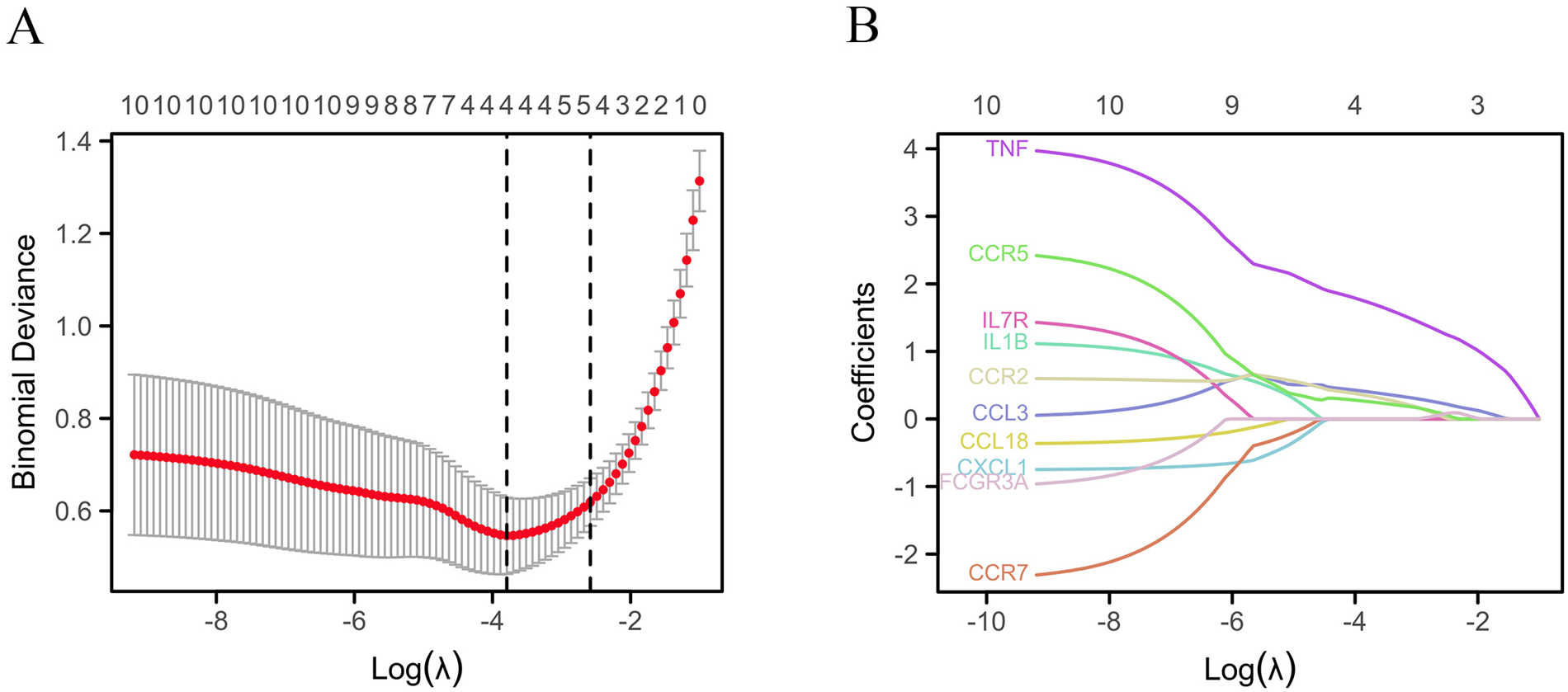 Identification of key genes. (A) Lasso cross validation diagram; (B) Lasso coefficient analysis diagram.
