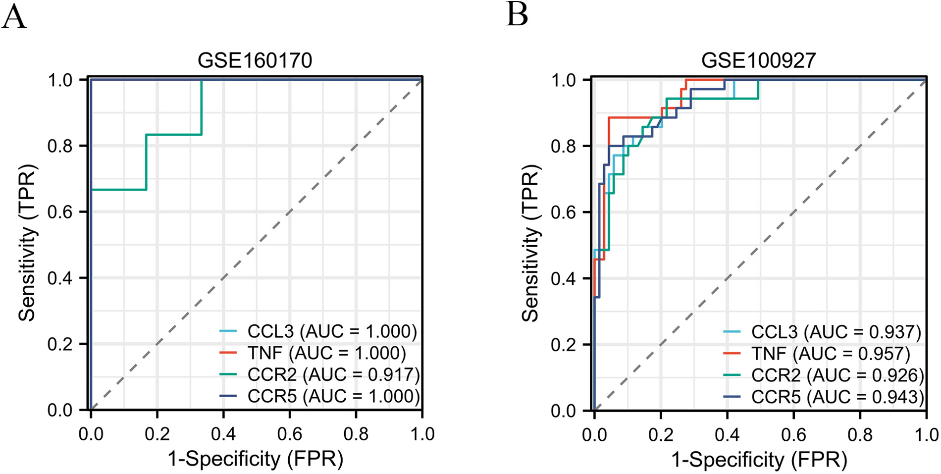 The ROC curves were utilized to assess the diagnostic value of these key genes in gout (A) and atherosclerosis (B).
