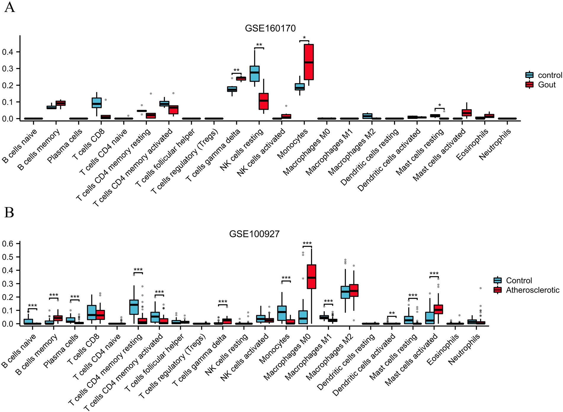 Analysis of immune cell infiltration in gout (A) and atherosclerotic (B) tissue samples.