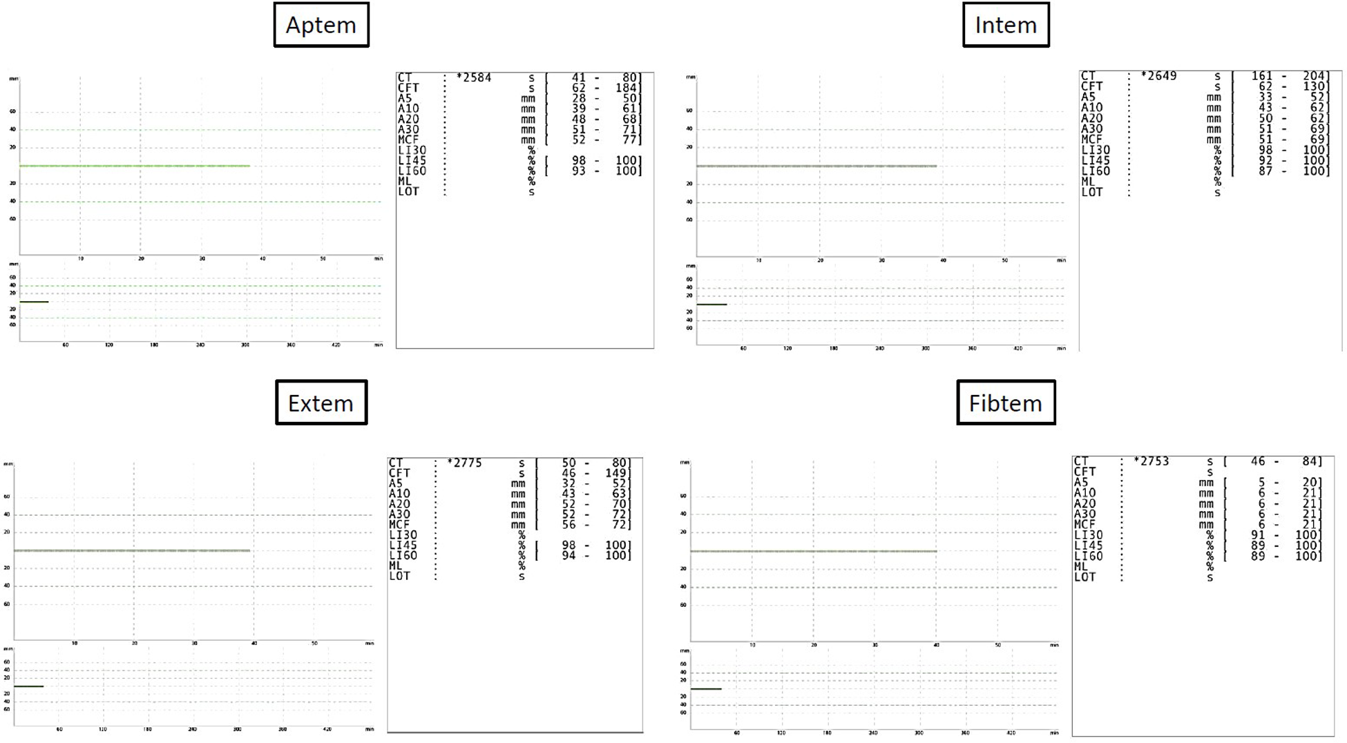 After initial treatment in the emergecy room, the patient was transferred to our intensive care unit under controlled ventilation for further treatment. No administration of vasopressors was necessary to maintain adequate mean arterial pressure. Notably, coagulation parameters were conspicuous as shown in Table 1. Rotational thromboelastometry (“ROTEM™”) was thus performed for extended coagulation diagnostics immediately after admission on the Intensive Care Unit. ROTEM™ results indicated an almost complete inapparency of all measured coagulation factors in all derivations (Figure 1). To achieve a rapid improvement in coagulation, substitution of 2,400 IU of Prothrombin concentrate, 2 platelet concentrates, 8 g of fibrinogen, 2,150 IU of factor XIII and 1 g of tranexamic acid as a bolus and an additional 1 g over 8 h for highly suspected disseminated intravascular coagulation was performed. The first arterial blood gas analysis showed a mild mixed respiratory and metabolic acidosis, as shown in Table 2. Temperature was continuously measured via an inserted urinary catheter after ICU admission. The patient was consistently normoterm (35.8° to a maximum of 37.7°C), so that no specific therapy was needed throughout ICU treatment. Analgo-sedation was stopped in order to achieve a rapid neurological assessment. Unfortunately, the patient did not provide an adequate wake-up response.