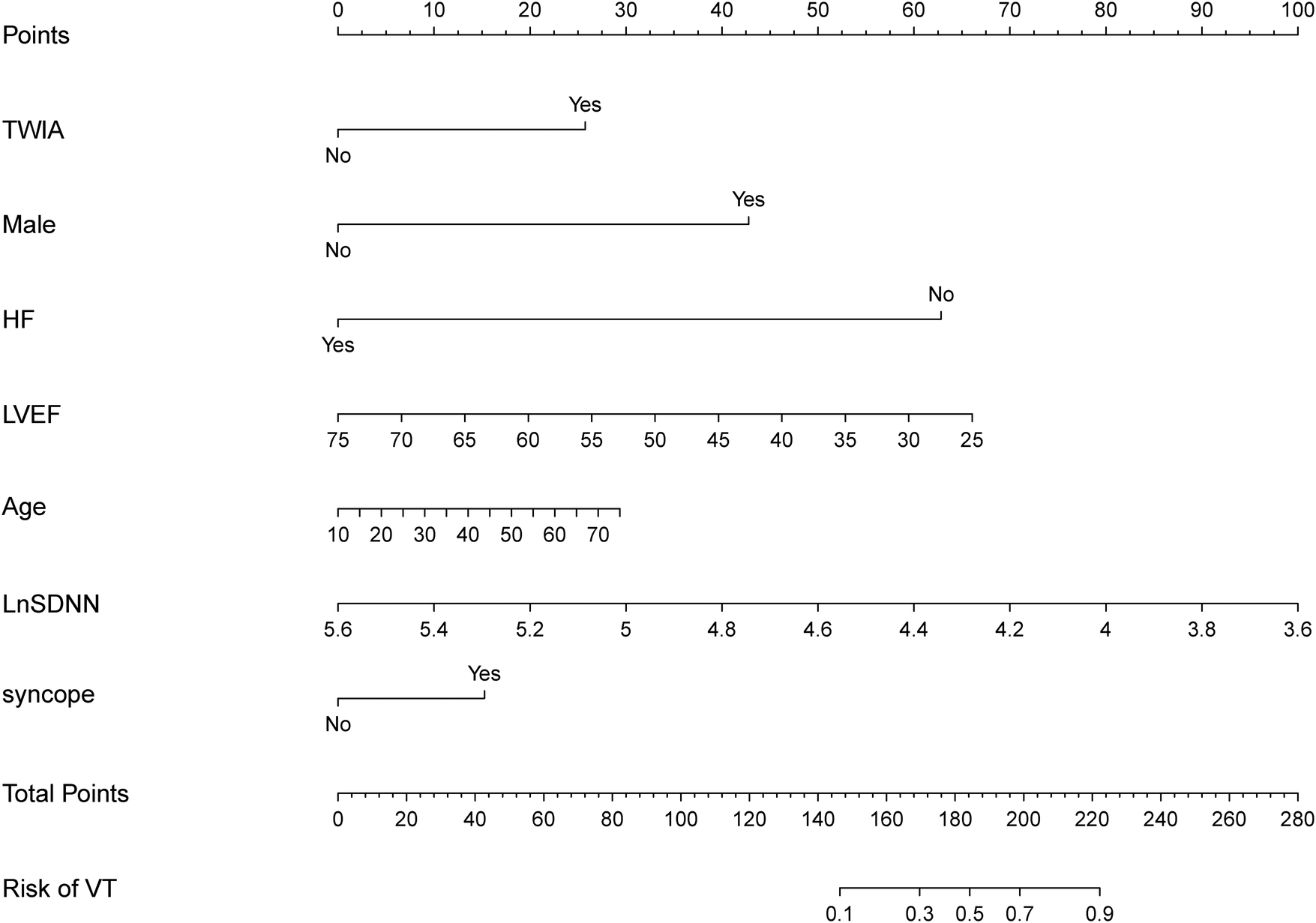 Based on the predictors identified by the LASSO logistic regression model in the training group, a nomogram was constructed in the training group for identifying ACM patients at high risk of sustained ventricular tachycardia (sVT). The nomogram included five significant predictive features and two canonical predictors (Figure 2). Each factor in the nomogram was assigned an individual score based on its value, and a total score was calculated by summing the scores of all factors. The final score derived from the nomogram could be utilized to estimate the risk of sVT for a given patient (Figure 2).
