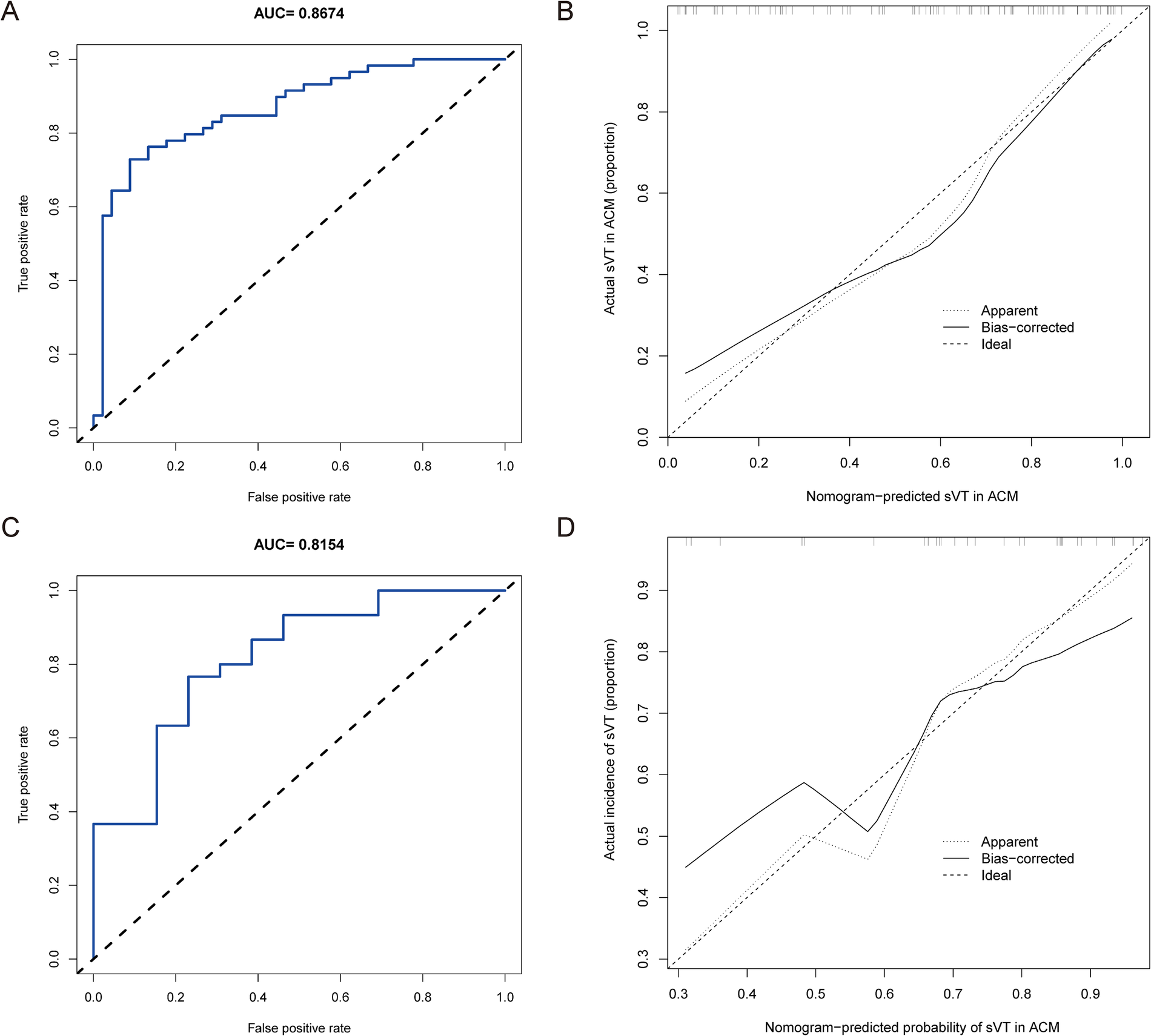 The nomogram was validated in both the training and validation groups. (A) The ROC curve was utilized to evaluate the performance of the nomogram in the training group. The AUC of the nomogram for predicting the occurrence of sVT in ACM patients was 0.867 (95% CI, 0.797–0.938). (B) The calibration curve in the training group demonstrated that the predictive nomogram provided excellent estimations of actual probabilities of sVT. (C) The ROC curve was used to evaluate the performance of the nomogram in the validation group. The AUC of the nomogram for predicting the occurrence of sVT in ACM patients was 0.815 (95% CI, 0.673–0.958). (D) The calibration curve in the validation group validated that the predictive nomogram provided excellent estimations of actual probabilities of sVT.
