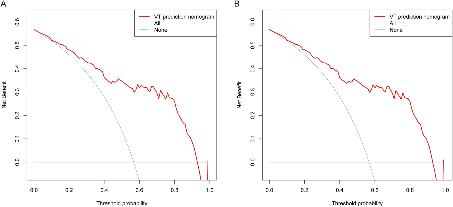 DCA was performed for the nomogram in both the training group (A) and the validation group (B) the red line indicated the predictive nomogram. The gray line represented the assumption that sVT occurred in all ACM patients, while the black line represented the assumption that no patient had sVT.