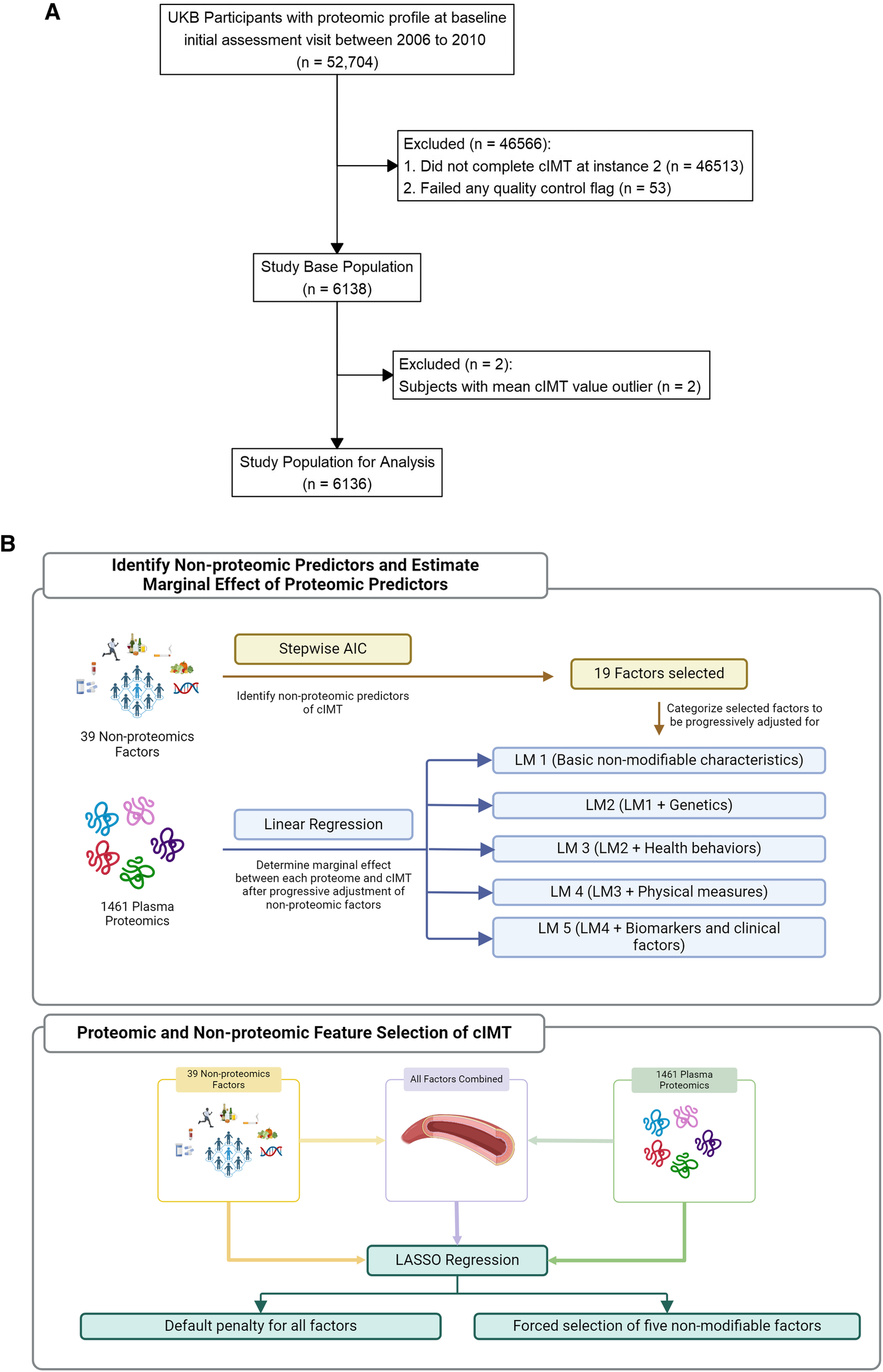 We first determined the marginal association between each non-proteomic factor and cIMT. Subsequently, we selected five non-modifiable characteristics (sex, age including at baseline and at the imaging visit, center of imaging visit, and self-reported ethnicity) to define a minimally adjusted model. We then applied an Akaike information criterion (AIC) based stepwise model selection algorithm to the remaining non-proteomic covariates of interest to identify a subset that improved the AIC for cIMT in a multivariable variable framework. Non-proteomic variables that were selected were then further grouped into four to allow for multivariate testing of five linear regression models (LM) with increasingly progressive covariate adjustment: (1) the five basic non-modifiable characteristics (LM 1), (2) model 1 plus multiple PRS (LM 2), (3) model 2 plus health behaviors (LM 3), (4) model 3 plus physical measures (LM 4), and (5) model 4 plus medical conditions (LM 5). More detailed analysis plan is described in Supplementary File.
