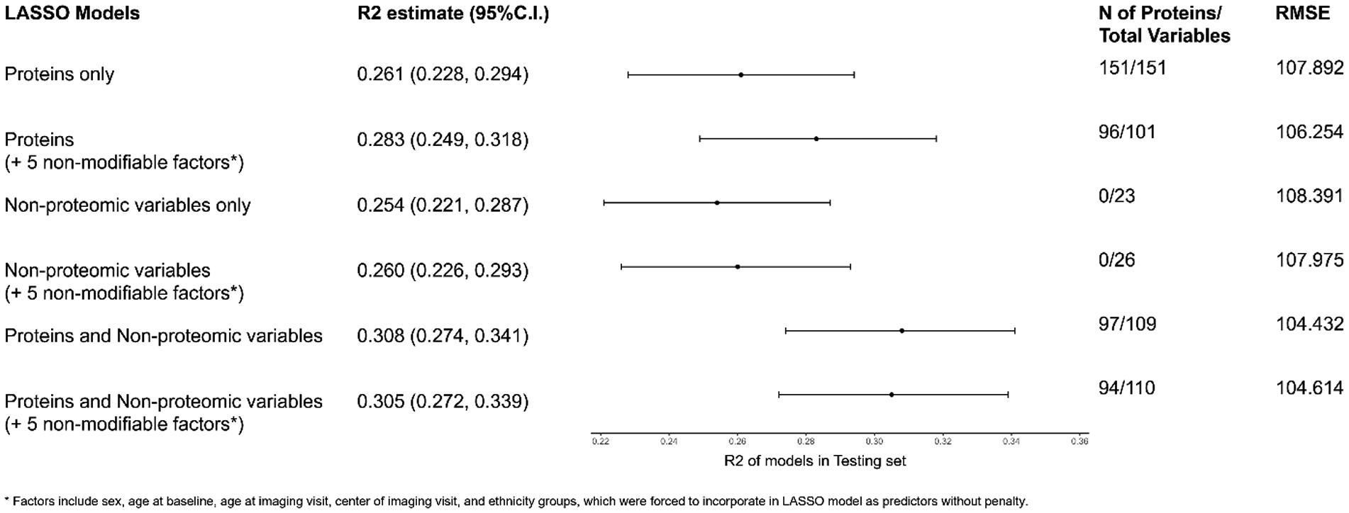 Using LASSO regression, we noted the following trends (Figure 2; Supplementary Table 6). In models that allowed for the selection of proteins, a range of 94–151 proteins were selected while in models with non-proteomic covariates, a range of 12–16 non-proteomic covariates were selected. A model restricted to non-proteomic measures explained the least variance (R2 = 0.254). A model including the five non-modifiable covariates in addition to proteins increased the variance explained (R2 = 0.283) to a degree that was comparable to models built from a combination of non-proteomic and proteomic predictors. A LASSO model combining 97 proteins with 12 non-proteomic factors performed the best in the testing set (R2 = 0.308). Lastly, we observed significant overlap of the 95% confidence intervals of all models that included at least some non-proteomic covariates. The cross-validation mean squared error plots of all six LASSO models for the study population are shown in Supplementary Figure 2. A summary of all proteomic and non-proteomic predictors selected by the linear regression or LASSO models is shown in Supplementary Tables 7, 8.