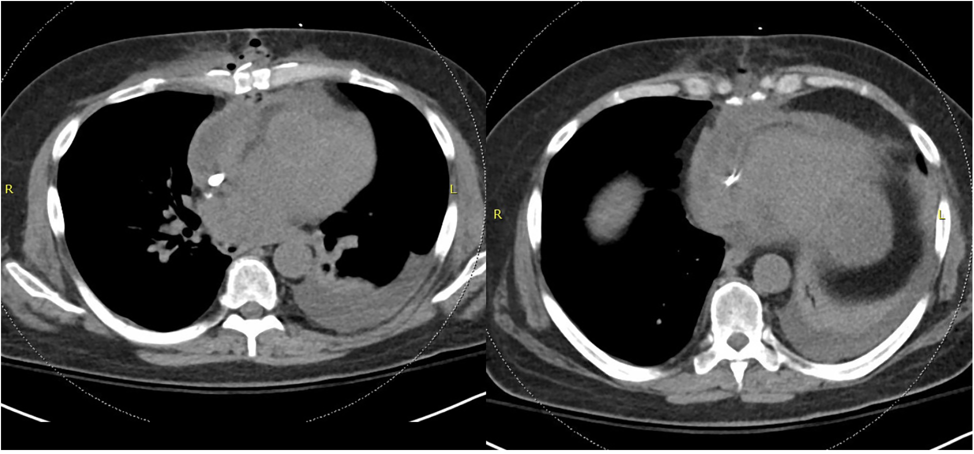 Non-contrasted CT chest demonstrating dehiscence of the chest wall incision with inflammatory changes and gas concerning for deep sternal wound infection.