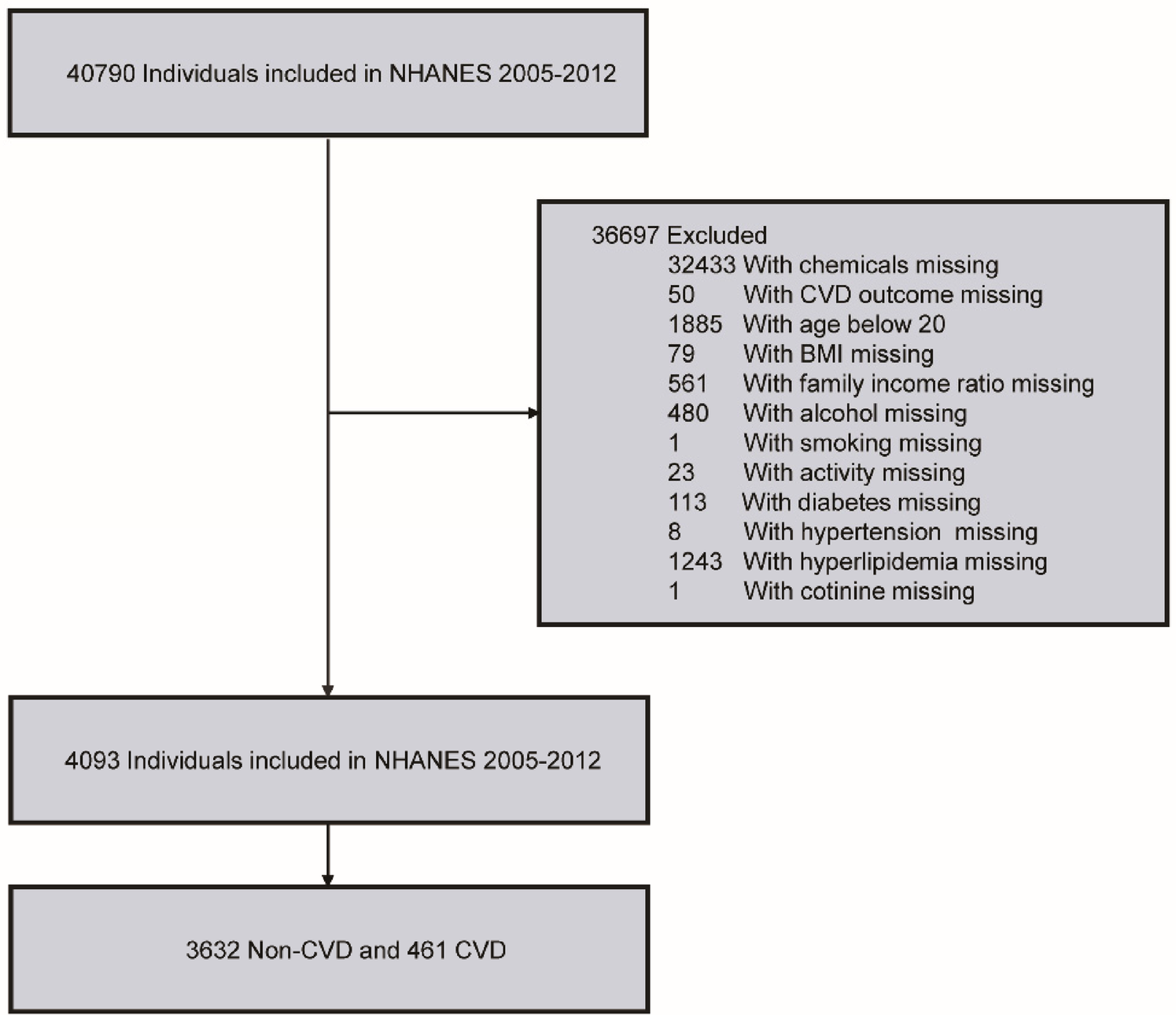 In this study, the data was collected from NHANES in 2005–2012. Initially, a total of 40,790 participants were identified. Then, 32,433 participants with missing PFC exposure values and 50 participants with missing CVD outcome were excluded. Participants were further included or excluded based on the following criteria: (1) demographic factors (gender, age ≥ 20, race, education, family income ratio); (2) lifestyle indicators (smoking status, alcohol consumption, physical activity); (3) disease history (hypertension, hyperlipidemia, diabetes); and (4) other indicators [body mass index (BMI), cotinine]. After applying these exclusion criteria, the final study cohort comprised 4,093 participants (Figure 1).