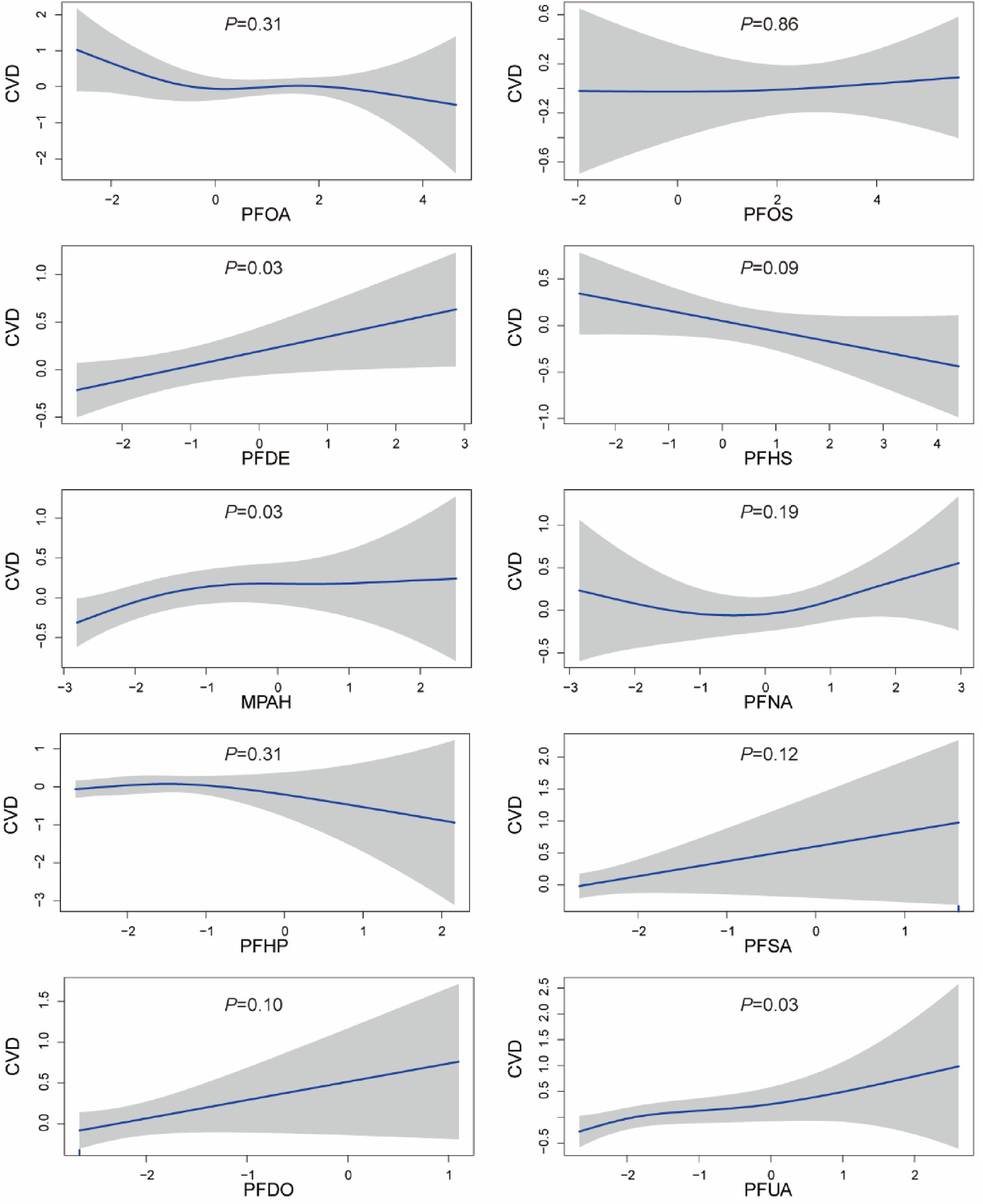 The linear association between PFCs and CVD was assessed using multiple logistic regression analyses, as summarized in Table 2. After adjusting for demographic covariates, our analysis revealed a positive correlation between MPAH and PFUA levels and CVD incidence (OR, 1.14; 95% CI, 1.02–1.27; P = 0.02; OR, 1.14; 95% CI, 1.00–1.31; P = 0.05; OR). After adjusting for all potential confounders, elevated serum concentrations of PFDE, MPAH, and PFUA were associated with increased incidence of CVD (OR, 1.17; 95% CI, 1.02–1.34; P = 0.03; OR, 1.15; 95% CI, 1.03–1.29; P = 0.01; OR, 1.21; 95% CI, 1.05–1.39; P < 0.01). However, no significant associations were observed for other PFCs.