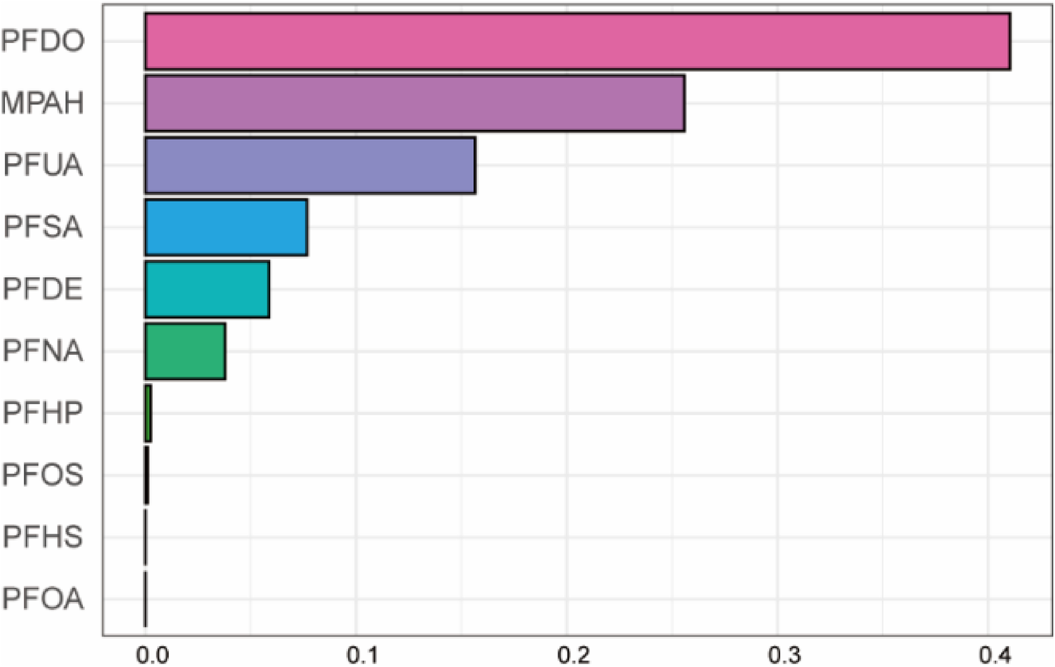 Polyfluoroalkyl chemicals (PFCs) are a class of synthetic organic compounds where the hydrogen atoms in the alkyl group are replaced by some or all of the fluorine atoms (16). PFCs are widely used in various industrial and consumer applications, such as manufacturing coatings, waterproof materials, food packaging, and cleaning agents, due to their excellent stability and corrosion resistance (17, 18). FPCs exhibit strong environmental persistence and can be detected around the world (19). As persistent organic pollution, FPCs can accumulate in the human body through drinking water, ingestion and other routes, causing significant health damage (20, 21). Numerous studies have shown that exposure to PFCs is associated with adverse health outcomes, including cancer, immune system dysfunction, reproductive disorders, and thyroid dysfunction (22–25). These findings have generated global concern and highlighted the importance of monitoring and regulating the use of PFCs to mitigate their impacts on human health and the environment.