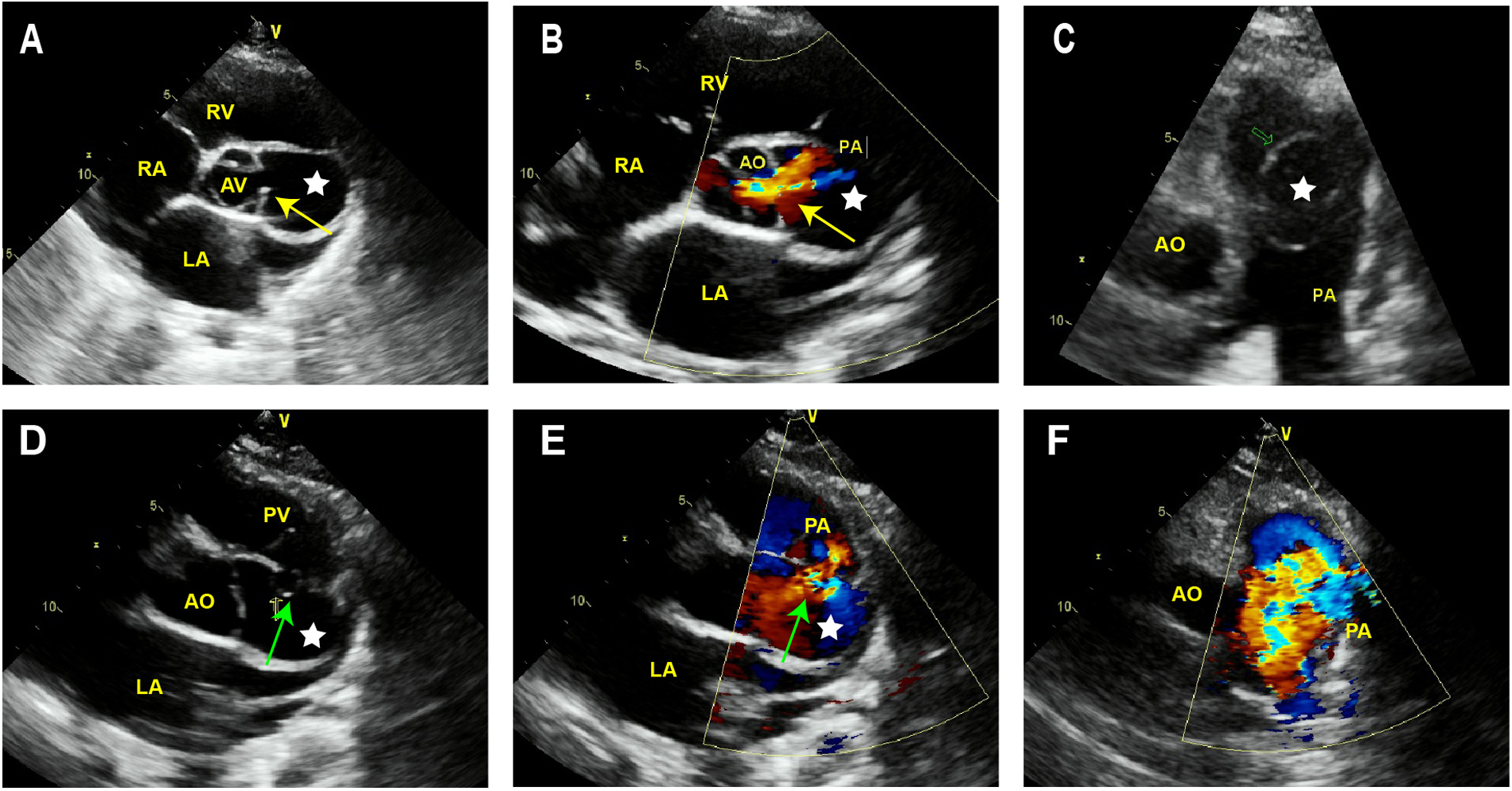 Transthoracic echocardiography of LVD. (A) The short axis sections of the aorta depict a cystic structure (white star) between the aorta and pulmonary artery. (B) Color Doppler imaging reveals that in the systolic phase, blood exhibits a flow trajectory enters the capsule cavity via the established communication port. (C) The long axis section of the pulmonary artery demonstrates that the cystic structure protrudes into the pulmonary artery. (D,E) At the top of this cystic structure, a gap of approximately 10 mm width can be observed communicating with the lateral wall of the pulmonary artery. (F) Colorful embedded high-speed blood flow signals can be observed in the pulmonary artery. AV, aortic valve; AO, aorta; PA, pulmonary artery; PV, pulmonary valve; LV, left ventricle; LA, left atrium; RV, right ventricle; RA, right atrium.
