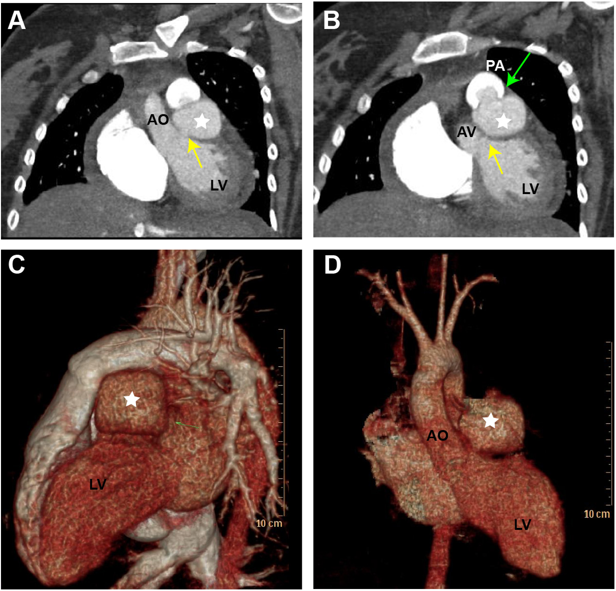 Computed tomography angiography (CTA) and three-dimensional computed tomography (3D-CT) scan of the LVD. (A) Display the cystic structure between the aorta and pulmonary artery (yellow arrow). (B) The cystic structure protrudes into the pulmonary artery (green arrow). (C,D) The 3D-CT scan illustrates the LVD in different views (white star). LV, left ventricle; AO, aorta; AV, aortic valve; PA, pulmonary artery.
