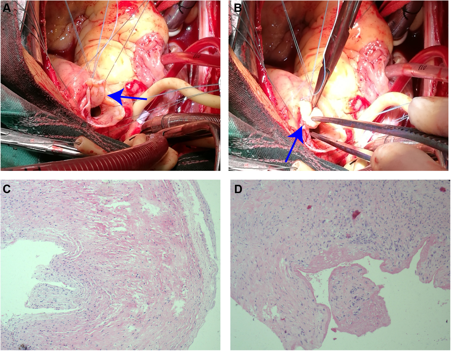 Surgical and pathological results. (A) The diverticulum adheres to the lateral wall of the left ventricular outflow tract (closely below the aortic annulus) through the small neck (blue arrow). (B) The diverticulum appears as a tumor-like protrusion, extending into the pericardial cavity and pulmonary artery (blue arrow). (C,D) Histopathological sections at 10 magnification: no epithelial lining in the capsule wall tissue. Myocardial cell atrophied and fibrosised, with some hyaline degeneration and local mucinous degeneration.