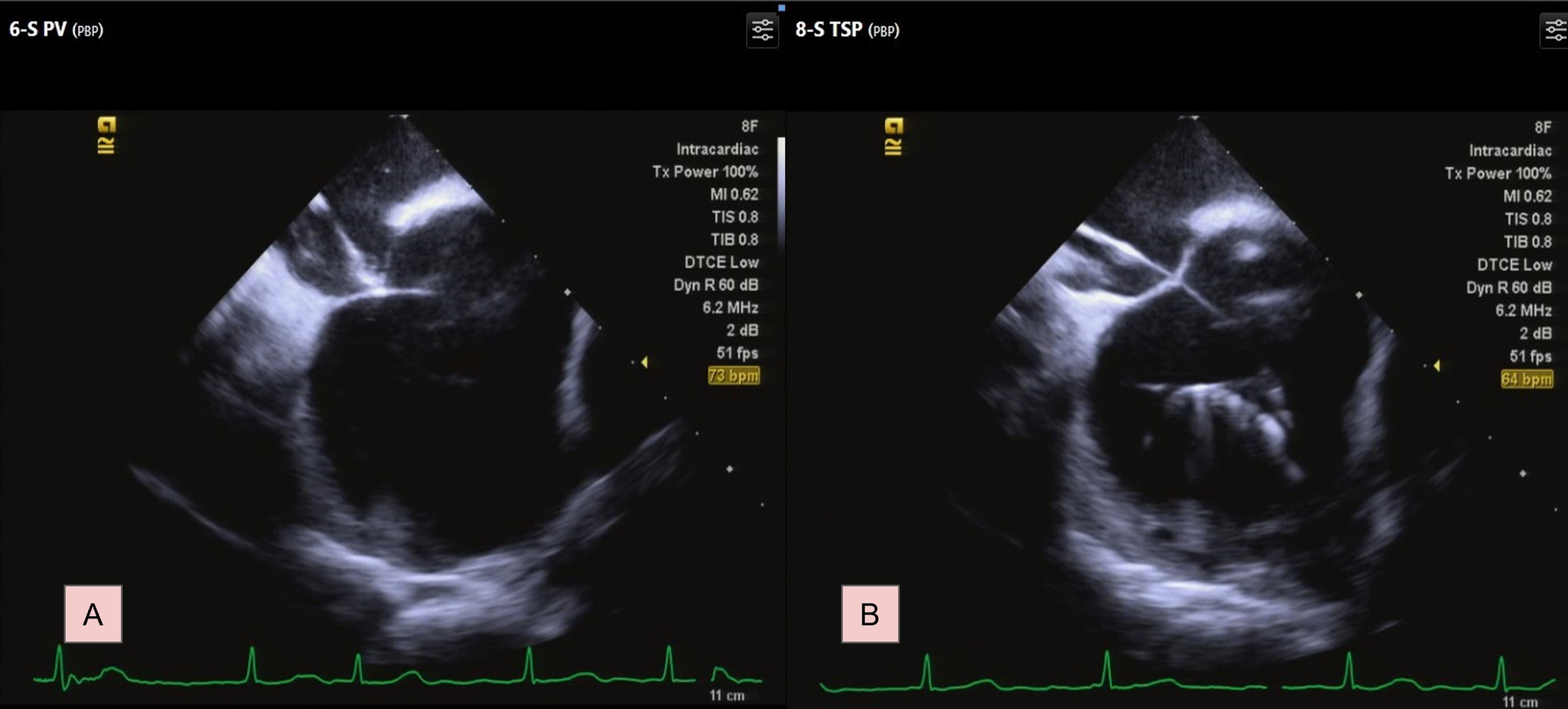 Transseptal process under ICE. (A) Identify the septum by typical tenting image. (B) The GMS-1 guidewire formed a pigtail shaped. For a complete video clip, please refer to Supplementary Video S1.