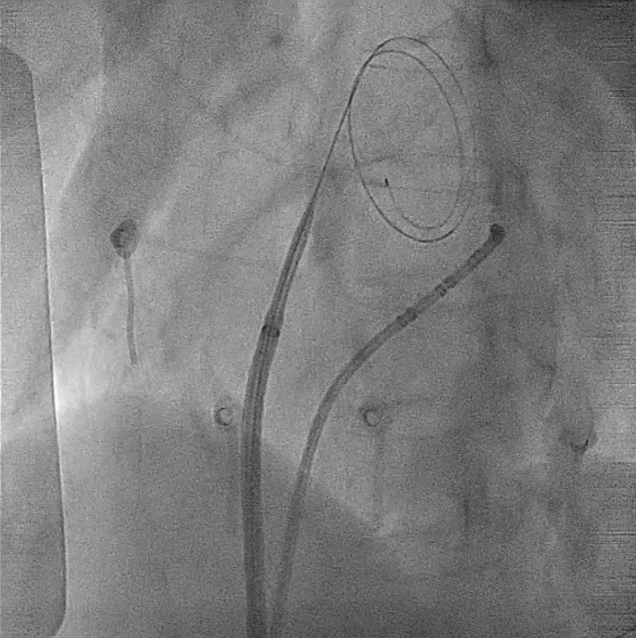 Transseptal process under fluoroscopy. The GMS-1 guidewire became pigtail configuration after crossing the septum. For a complete video clip, please refer to Supplementary Video S2.