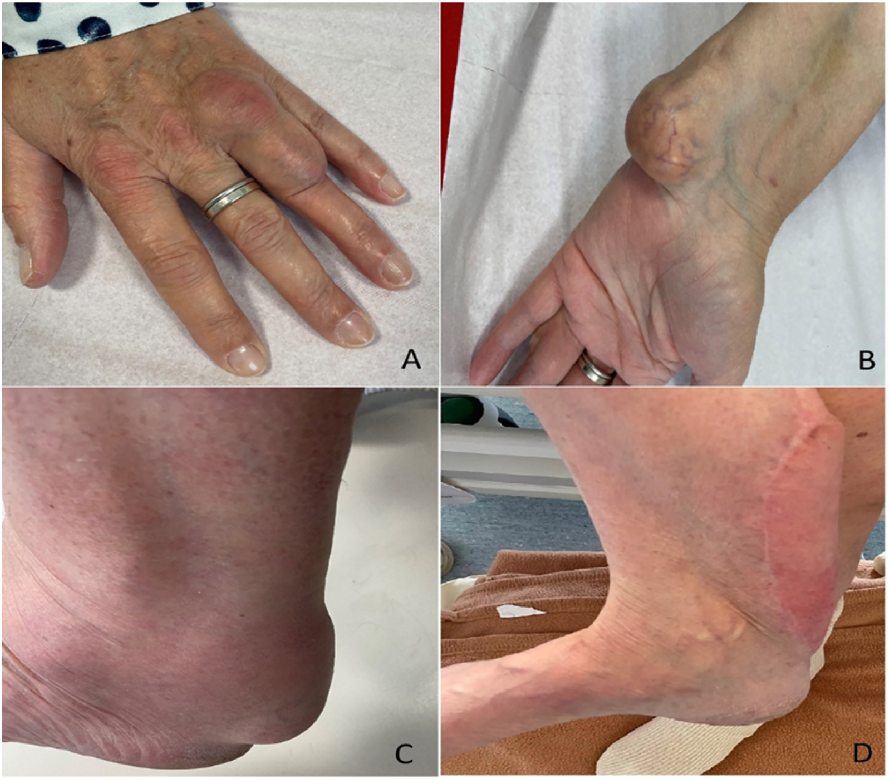 Xanthomas of the left extensor tendon of the hand (A), left flexor tendon of the wrist (B), and bilateral Achilles tendons (C,D).