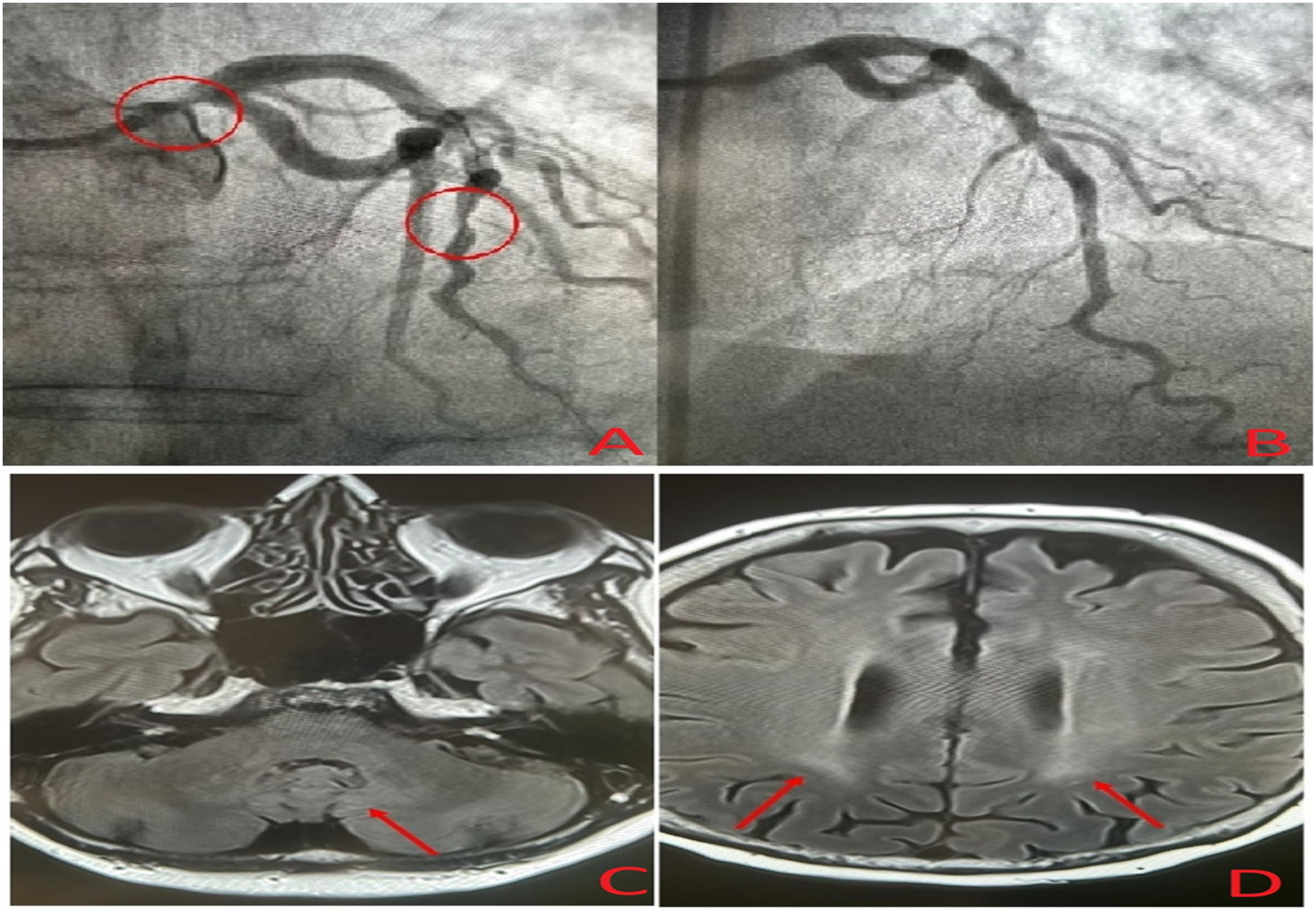 Coronary angiogram showing severe narrowing of the left main and left anterior descending coronary arteries (A), post-treatment coronary angiogram after percutaneous coronary intervention (B), and brain magnetic resonance imaging showing mild symmetrical FLAIR hyperintensities in the dentate nuclei (C) and periventricular white matter (D).