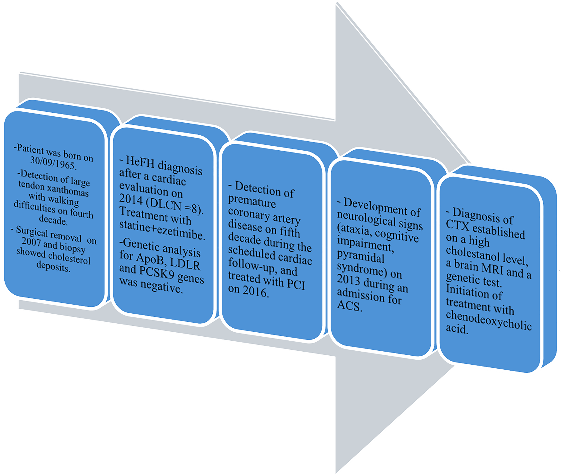 Timeline of the reported case of CTX. HeFH, heterozygous familial hypercholesterolemia; DLCN score, Dutch Lipid Clinic Network score; PCI, percutaneous coronary intervention; ACS, acute coronary syndrome.