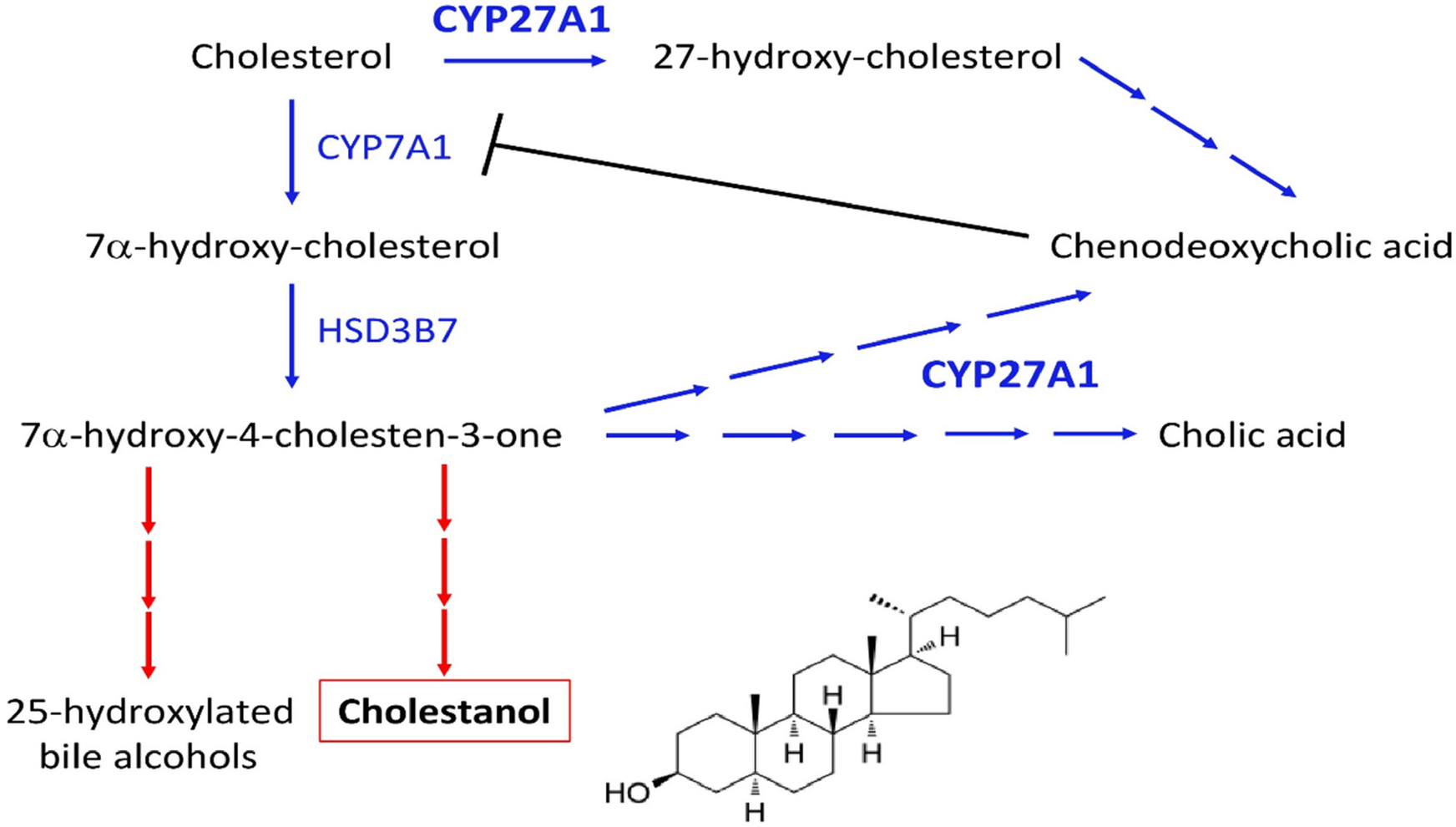 Bile acids (cholic acid and chenodeoxycholic acid) are synthesized in the liver from cholesterol via two distinct pathways implicating the enzyme sterol 27-hydroxylase (CYP27A1). This process is negatively regulated by chenodeoxycholic acid, which suppresses the transcription of cholesterol 7α-hydroxylase (CYP7A1), the rate-limiting enzyme. Deficient activity of CYP27A1 results in reduced production of bile acids and abnormal production of cholestanol (also named dihydrocholesterol; InChIKey: QYIXCDOBOSTCEI-QCYZZNICSA-N) and 25-hydroxylated bile alcohols (Figure 4). The pathophysiology of CTX is based on the reduced activity of the mitochondrial enzyme sterol 27-hydroxylase, which plays a key role in cholesterol metabolism and bile acid synthesis pathways (3–6). This deficiency results from pathogenic variants of the CYP27A1 gene and impairs the alternative metabolic pathway of bile acid synthesis, compromising cholesterol side-chain oxidation and chenodeoxycholic acid formation (3–6). Then, the main consequences are the loss of negative feedback regulation by chenodeoxycholic acid on the classic pathway of bile acid synthesis, the upregulation of 7α-hydroxylase, and increased levels of 7α-hydroxy-4-cholesten-3-one and its metabolites, especially cholestanol (3–6) (Figure 5). The clinical manifestations and development of CTX result from cholesterol and cholestanol accumulation in various organs. The accumulated cholestanol mainly results from the conversion of 7α-hydroxy-4-cholesten-3-one into cholestanol and bile alcohols. To date, the deposition of cholestanol in the brain is not entirely understood, and three hypotheses have been proposed: increased blood–brain barrier permeability, cholestanol production in the brain from cholesterol and its intermediates, or conversion of 7α-hydroxy-4-cholesten-3-one to cholestanol by microglia, neurons, and astrocytes after crossing the blood–brain barrier (7). Pathological findings in CTX patients include numerous yellowish deposits in the Choroid plexus and brain white matter on macroscopic examination and various scattered lipid crystal clefts in the cerebellar hemispheres on microscopic examination (8).