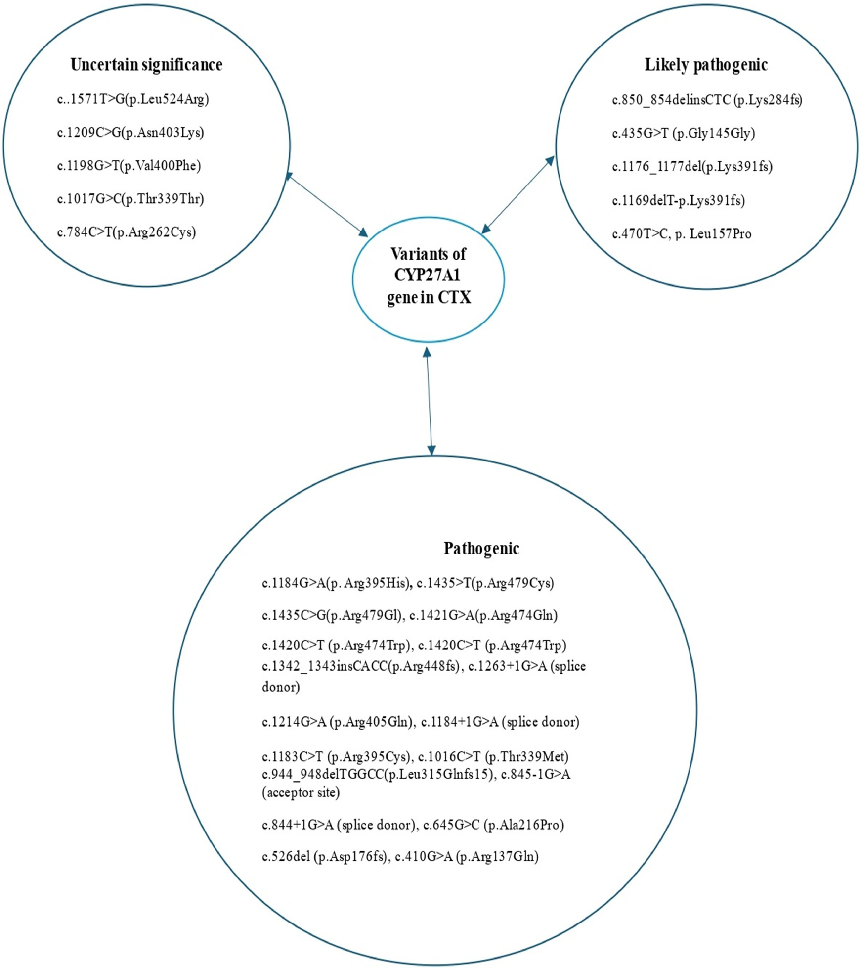 An average delay of 16 years between symptom onset and time of diagnosis has been reported in CTX (12). The four pillars of CTX diagnosis are clinical, biochemical, neuroradiological, and genetic findings (Figure 6). A high cholestanol plasma level is the hallmark biomarker of CTX (5). The biochemical abnormalities found in CTX patients include elevated concentrations of other cholesterol precursors like 7- and 8-dehydrocholesterol (13), high levels of bile alcohols such as glucuronides in plasma and urine, increased bile acid precursors in plasma and bile, and decreased chenodeoxycholic acid levels. It is noteworthy that a few cases of atypical CTX with normal or near-normal cholestanol levels have been reported; however, in these cases, elevated levels of bile acid precursors and bile alcohols were found (14). The diagnosis was genetically and clinically confirmed by the presence of large extensor tendon xanthomas (14). Therefore, a normal plasma cholestanol level is insufficient to exclude a diagnosis of CTX. Brain MRI plays a significant role in the diagnosis, especially in CTX patients with neurological signs. The most distinctive findings of CTX include increased signal intensity on T2-weighted and/or FLAIR images in the dentate nuclei and the surrounding cerebellar white matter(2). Different neuroradiological findings depending on the clinical status of the patient could also be detected. Recently, cerebellar vacuolization on T1-weighted and/or FLAIR images has been identified as a predictor of poor prognosis (2). The gold-standard test for a definitive diagnosis of CTX is the identification of biallelic pathogenic CYP27A1 variants. To date, several pathogenic and likely pathogenic variants have been identified, including c.1435>T (p.Arg479Cys), c.1435C>G (p.Arg479Gly), c.1421G>A (p.Arg474Gln), c.1420C>T (p.Arg474Trp), c.1342_1343insCACC (p.Arg448fs), c.1263+1G>A (splice donor), c.1214G>A (p.Arg405Gln), c.1184+1G>A (splice donor), c.1183C>T (p.Arg395Cys), c.1176_1177del (p.Glu392fs), c.1169delT (p.Lys391fs), c.1016C>T (p.Thr339Met), c.944_948delTGGCC (p.Leu315Glnfs15), c.850_854delinsCTC (p.Lys284fs), c.845-1G>A (acceptor site), c.844+1G>A (splice donor), c.645G>C (p.Ala216Pro), c.526del (p.Asp176fs), c.435G>T (p.Gly145Gly), and c.410G>A (p.Arg137Gln) (7) (Figure 7). The c.1184G>A variant has previously been described in a homoallelic patient with CTX. However, the c.470T>C variant is very rare, has not yet been published in the literature, and is still classified as a variant of uncertain significance. The American College of Medical Genetics and Genomics (ACMG) criteria given by GeneBe and hg38 InterVar are PM2 PP3 and PM1 PM2, respectively. For instance, prior to our report, according to GeneBe, it is stated that “The NM_000784.4 (CYP27A1): c.470T>C (p. Leu157Pro) variant causes a missense change involving the alteration of a non-conserved nucleotide. The variant allele was found at a frequency of 0.000000684 in 1,461,838 control chromosomes in the GnomAD database, with no homozygous occurrence. In-silico tool predicts a pathogenic outcome for this variant. Variant has been reported in ClinVar as Uncertain significance (VUS).” The addition of the following two criteria, PM3 (recessive disorders, detected in trans with a pathogenic variant) and PP4 (patient phenotype or family history is highly specific for a disease with a single genetic etiology), thus reclassifies the c.470T>C variant from class 3 (VUS) to class 4 or likely pathogenic.