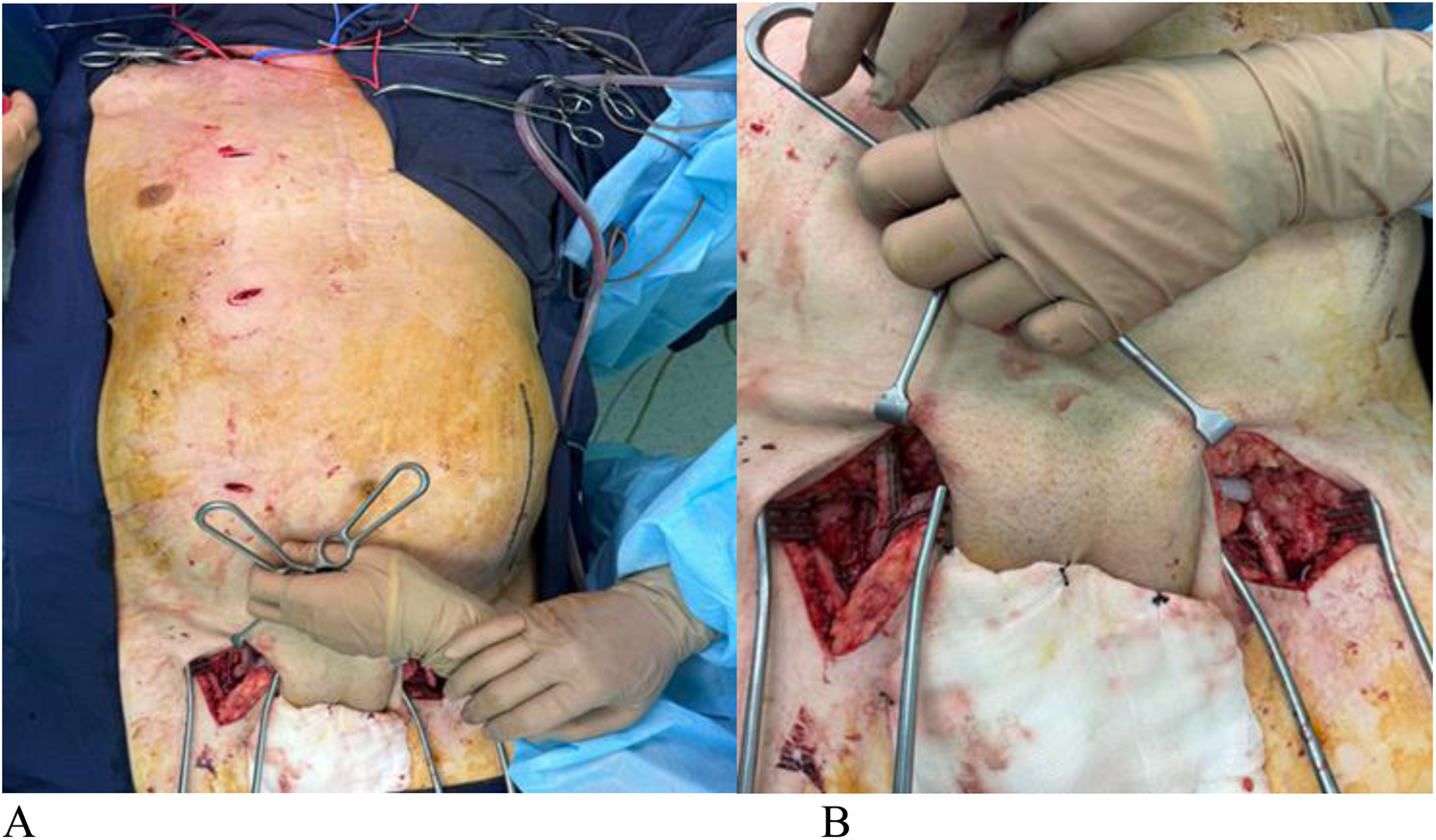 On the right side, clamps were applied to the common femoral, deep femoral, and superficial femoral arteries, and a proximal anastomosis with a 7 mm “Vascutek” allograft was created in an end-to-side configuration with the common femoral artery, using 6/0 Prolene sutures. Once the anastomosis was complete, clamps were removed from the right-side arteries (Figure 3A). The allograft was tunneled subcutaneously over the pubic bone. On the left side, clamps were similarly applied to the common femoral, deep femoral, and superficial femoral arteries. An arteriotomy was performed on the left common femoral artery above the origin of the deep femoral artery, and a distal anastomosis with an 8 mm “Vascutek” allograft was created, again using 6/0 Prolene sutures. After ensuring satisfactory blood flow and preventing air embolism, the clamps were removed, and satisfactory pulsation was observed below the anastomoses on both sides (Figure 3B).