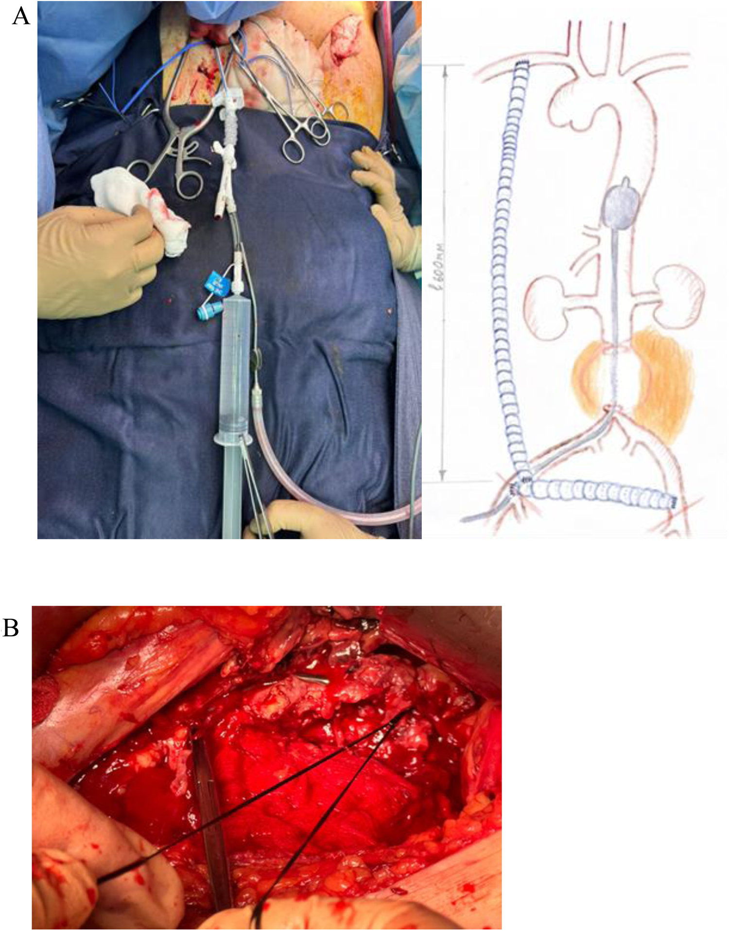 Next, the abdominal aortic aneurysm was accessed via a pararectal approach. Despite technical difficulties and the presence of a surrounding hematoma, the aneurysm was exposed. To prevent massive blood loss, an aortic balloon catheter was inserted into the descending thoracic aorta through the right common femoral artery in collaboration with interventional radiologists. During the exposure of the aneurysm, massive bleeding occurred from the rupture site. The balloon catheter was positioned in the descending aorta above the rupture to control the hemorrhage (Figure 4A). The aortic walls were found to have atherosclerotic changes. The aneurysm neck was exposed below the renal arteries, and clamps were applied both above and below the aneurysm (Figure 4B).