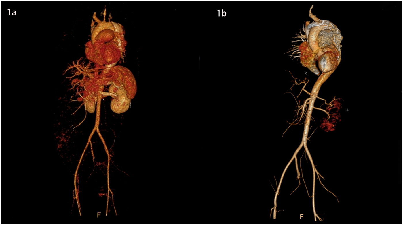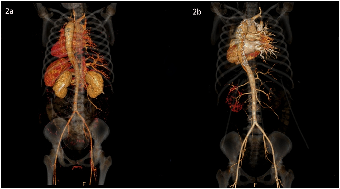 A 29-year-old pregnant woman was 157 cm in height and 80 kg in weight. Pregnant at 35 weeks +6 days, gravida 1, para 0. The patient presented to the emergency department with sudden and continuously unrelieved chest pain without a definite cause. Physical examination revealed reduced bilateral carotid pulsation, with the apex pulse located 0.5 cm within the midclavicular line of the fifth intercostal space, regular heart rate on auscultation, no murmur in the auscultation area of each valve, and edema of both lower limbs. Her oxygen saturation was 98%, the blood pressure 131/65 mmHg in the left upper extremity, 165/93 mmHg in the right upper extremity, 200/75 mmHg in the left lower extremity, 209/73 mmHg in the right lower extremity, heart rate 98 beats per minute, and respiratory rate 22 breaths per minute. Emergency echocardiography: EF 64%; Little regurgitation of aortic and pulmonary valve; AD was suspected. Thoracoabdominal aorta CTA: the posterior part of the aortic arch to the descending aorta was double-lumen like, the true lumen was small, the false lumen was large, and the first tear was located in the posterior part of the aortic arch, Acute TBAD (Figures 1a, 2a, 3a,c). Her blood pressure could not be lowered with Urapidil, therefore she was diagnosed with complex Stanford type B aortic dissection. Fetal ultrasound: single fetus, stable vital signs, head presentation, intrauterine pregnancy (gestational age 35 weeks 6 days). D-dimer 1.47 (mg/L), high-sensitivity C-reactive protein 96.75 (mg/dl), white blood cell 15.94  ×  109/L. 7 days before the onset of chest pain, she had an upper respiratory infection, took 2 bags of honeysuckle granules, and had not yet recovered when she was diagnosed with TBAD.