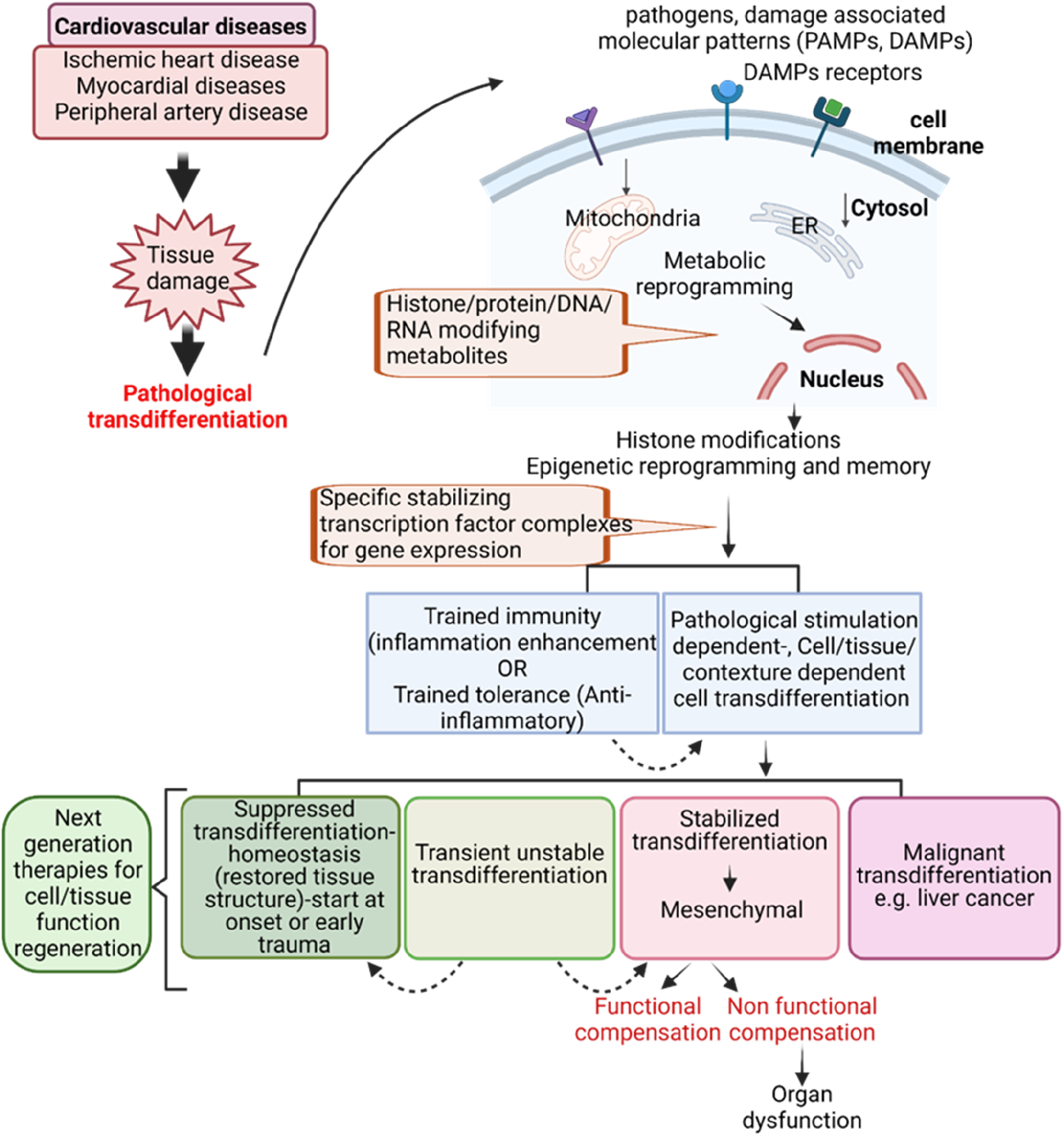 In this prospective, we propose pathological transdifferentiation as a new concept and novel therapeutic target for functional tissue regeneration following tissue damage related to cardiovascular diseases and chronic inflammation. Unlike current therapies targeting the proinflammatory cytokine-driven early phase of cardiovascular inflammation and innate immune memory (also known as trained immunity 48–50), our focus here is on targeting pathological transdifferentiation after tissue damage. Further understanding of pathological transdifferentiation in cardiovascular diseases and chronic inflammation will significantly advance the development of new therapies for these conditions.