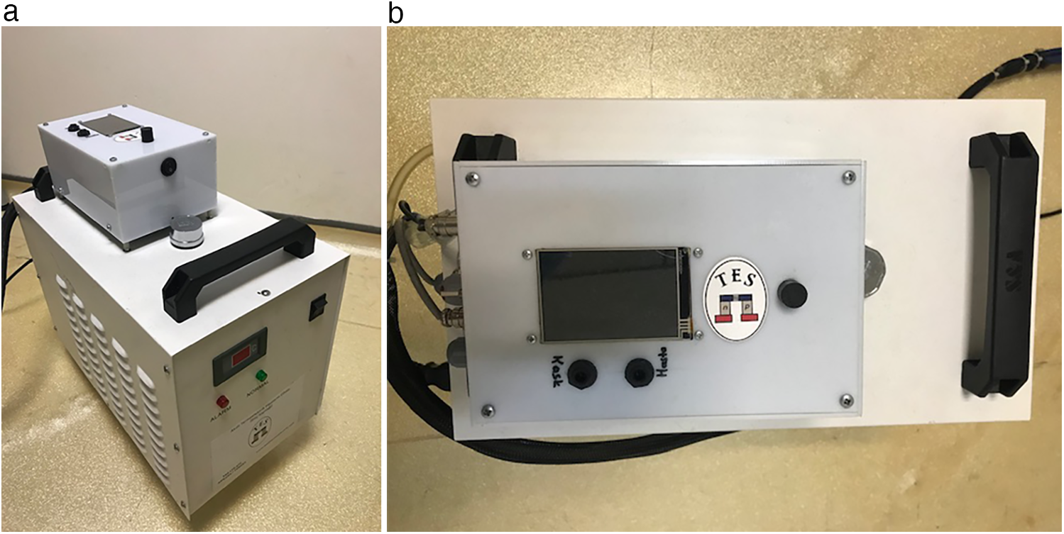 Thermohypothermia device. (a) Front view of the thermohypothermia device. (b) Top view of the thermohypothermia device.
