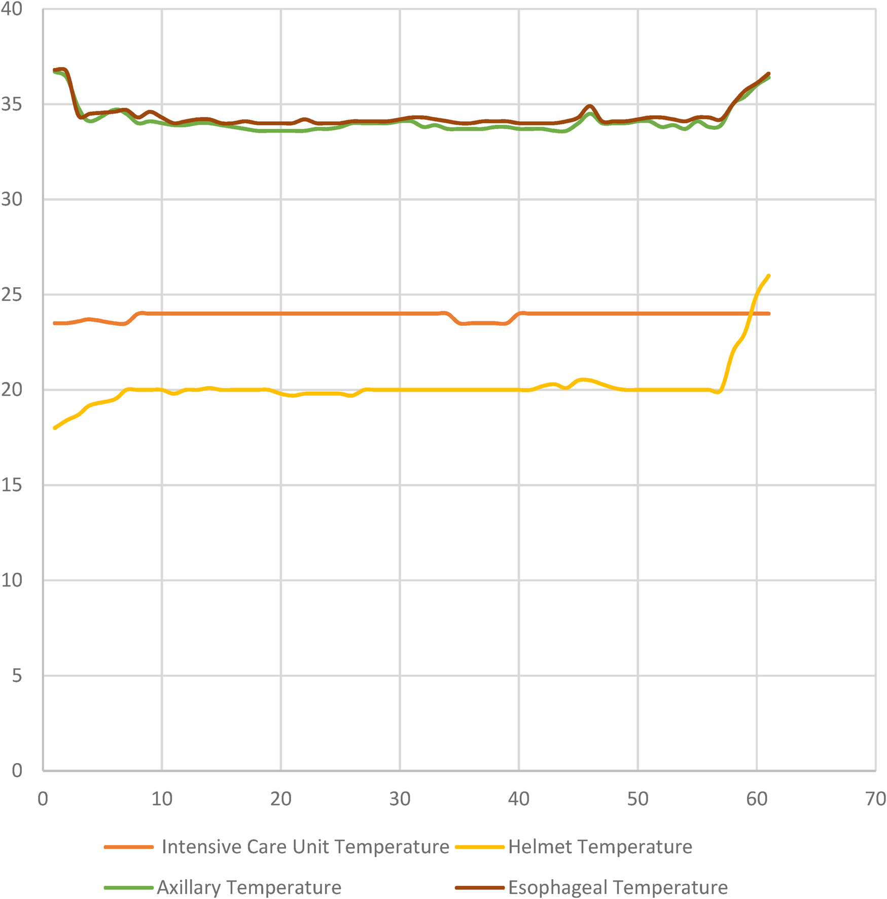 The thermoelectric hypothermia helmet employed in this study was designed to achieve controlled cooling specifically targeting the head region in patients with post-cardiac arrest syndrome. The in-helmet temperature represents the temperature measured within the space between the patient's skin and the helmet, influenced by the cooling effect of the integrated thermoelectric micromodule. While this measurement reflects the cooling efficiency of the helmet, it does not directly correlate with the brain temperature. Instead, it serves as an indirect indicator of the cooling effect on the brain. To standardize temperature management and align with conventional practices, esophageal temperature was utilized as the target body temperature in this study. This approach is consistent with widely recognized temperature management systems, such as Thermogard and Arctic Sun, which rely on continuous core body temperature monitoring as a standard for guiding therapeutic hypothermia. These systems ensure precise control over the cooling process, reducing variability and optimizing patient outcomes. Since direct measurement of brain temperature was not conducted, the expected brain temperature was inferred based on the combined analysis of in-helmet temperature and esophageal temperature, reflecting the potential impact of localized head cooling on cerebral thermoregulation.
