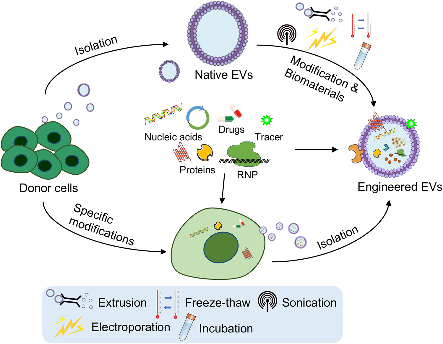 Engineering strategies for the targeting and functional modulation of EVs. Strategies such as genetic modification of parent (donor) cells to overexpress therapeutic nucleic acids or proteins, surface modification for improved targeting (e.g., cardiac-homing peptides), and cargo loading techniques (e.g., extrusion, freeze–thaw cycles, sonication, electroporation, incubation or combination with biomaterials) have been developed. These strategies aim to improve targeted delivery to cardiovascular tissues, functional modulation of EVs, and their ability to support angiogenesis, reduce fibrosis, and repair damaged heart tissue. The figure was partly generated via Servier Medical Art, provided by Servier, licensed under a CC BY 3.0.
