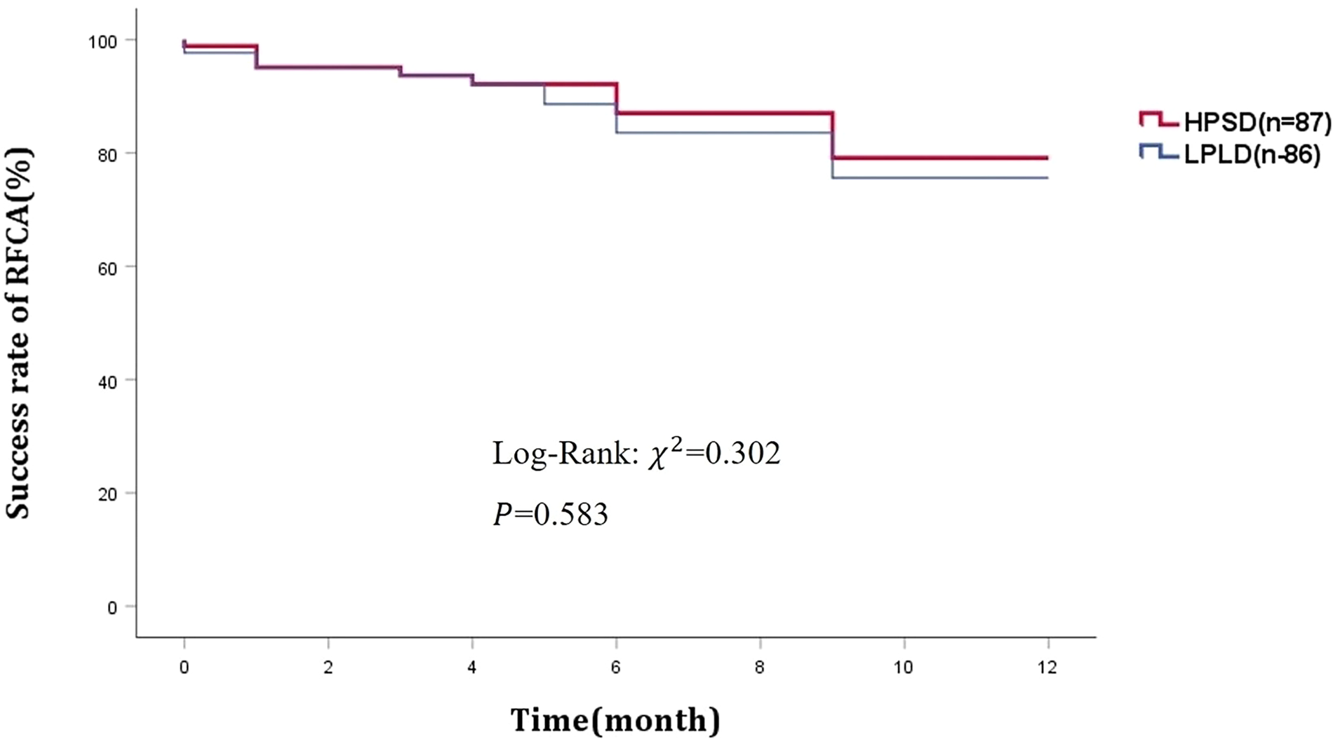 At one-year follow-up, sinus rhythm was maintained in 77 patients in the HPSD group and 74 patients in the LPLD group, with no significant difference between the two group (Figure 2). Postoperative complications occurred in 5 patients in the HPSD group and 3 patients in the LPLD group. Two cases of small femoral vein thrombosis occurred in each group postoperatively. After treatment with low molecular weight heparin, the thrombi resolved. Follow-up examinations after discharge revealed no recurrence of femoral vein thrombosis in any of these cases. Importantly, there were no major adverse cardiac and cerebrovascular events (MACCE) in either group (Table 3).
