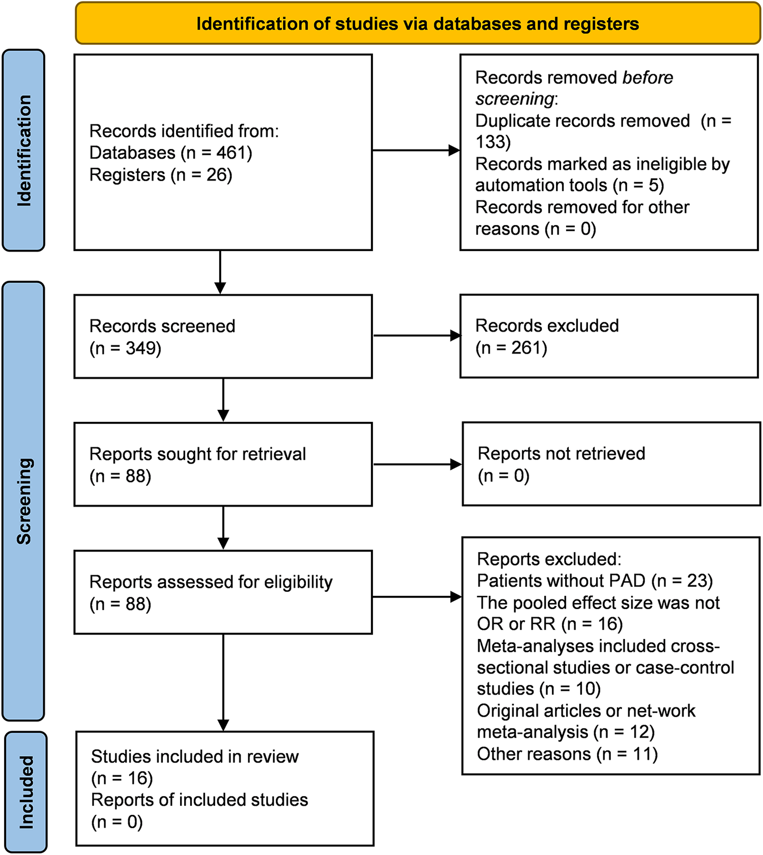 (a) patients presenting with symptoms of PAD (intermittent claudication or critical limb ischemia documented by digital subtraction angiography); (b) only drug coated ballon angioplasty was considered as intervention and plain old balloon angioplasty was considered as control; (d) meta-analyses enrolling RCTs or cohort studies; (e) the pooled effect size was OR or RR, and MD or SMD.