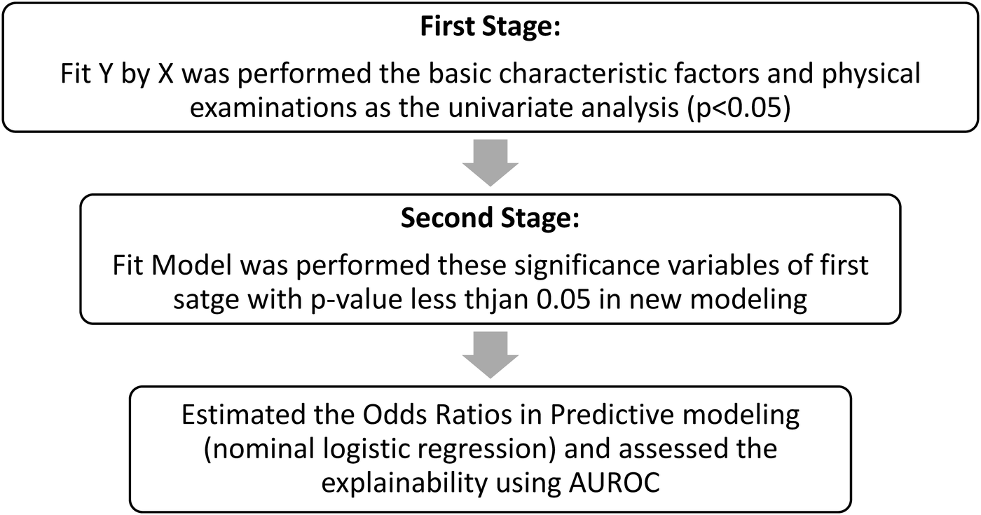 The workflow of two-stage exploration. The comprehensive analysis workflow followed the first stage (univariate analysis), the second stage (multivariate analysis), and predictive modeling (AUROC estimation) for clarifying the relative risk (odds ratio) for hypertension in a biobank study.