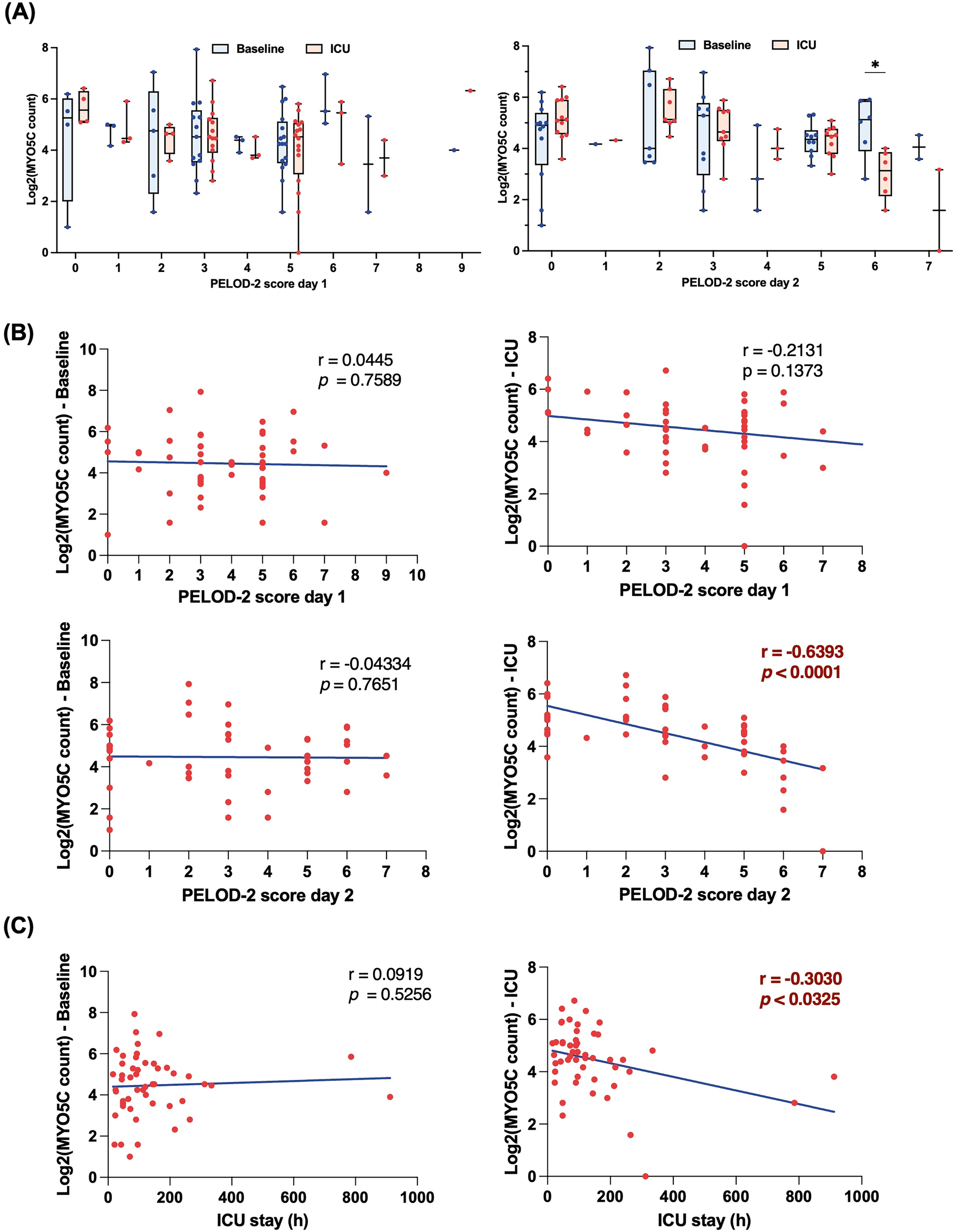 For the analysis of clinical data, we utilized IBM SPSS Statistics, Version 30.0 (IBM Corp., NY, USA). Categorical variables were presented as numbers and percentages, while continuous variables were summarized as means and standard deviations for normally distributed variables, or medians and interquartile ranges for skewed distributions. The normality of variables was assessed using the Shapiro–Wilk test. Categorical variables were compared using chi-square test, Fisher exact test, or Kruskal–Wallis test as appropriate. Continuous variables were analyzed using Student's t test or Mann–Whitney U test, depending on their distribution. Logistic regression models were constructed to assess whether the association between myo5c expression (at baseline or ICU admission) and postoperative complications was confounded by clinical variables. Variables with a p-value <0.05 in univariable analysis were included in the models as potential confounders. For correlation analysis, Pearson or Spearman correlation coefficient was determined based on the normality of the data. Laboratory data were analyzed as outlined in the corresponding figure legends. Statistical significance was set at p value < 0.05. All statistical analyses were performed using Prism 10 software (GraphPad Software, La Jolla, CA, USA).