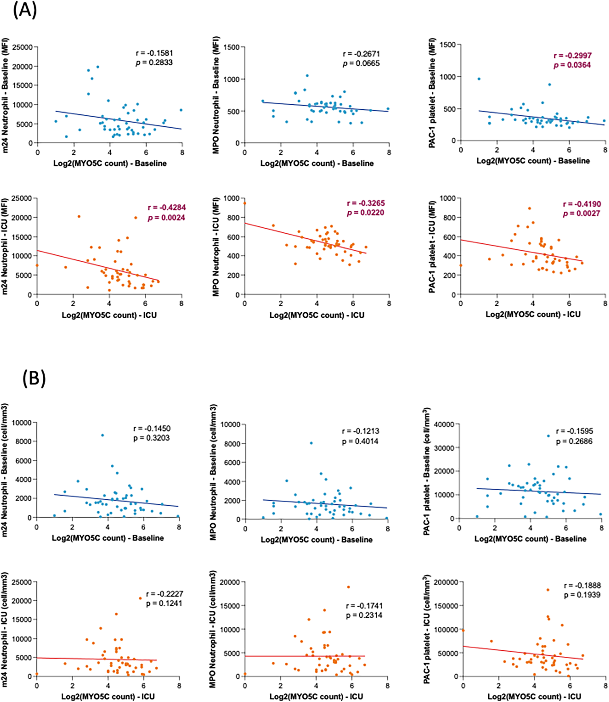 Supplementary Figure S6Myo5c expression in STAT category <3 vs. ≥3. Box plots showing expression at baseline (blue) and upon ICU admission (red). ns = not significant.